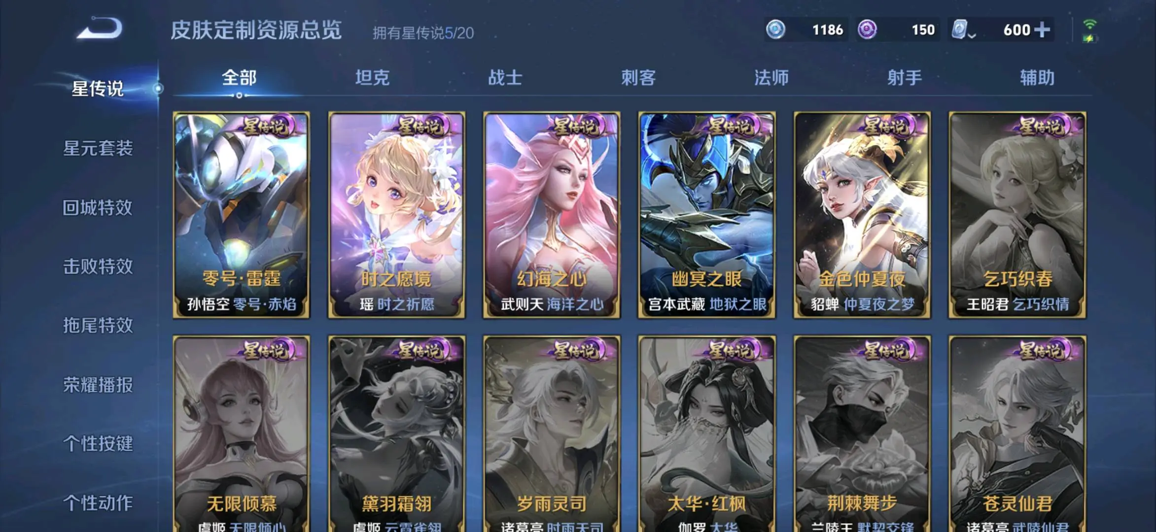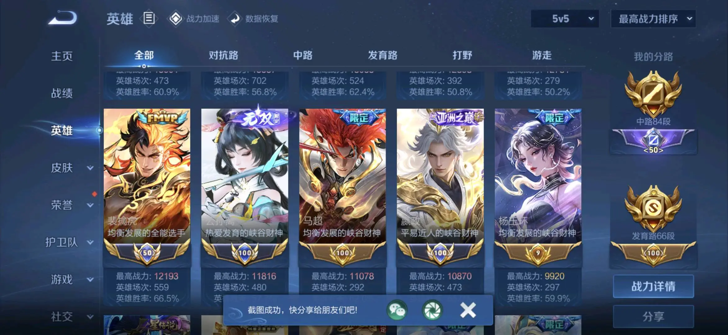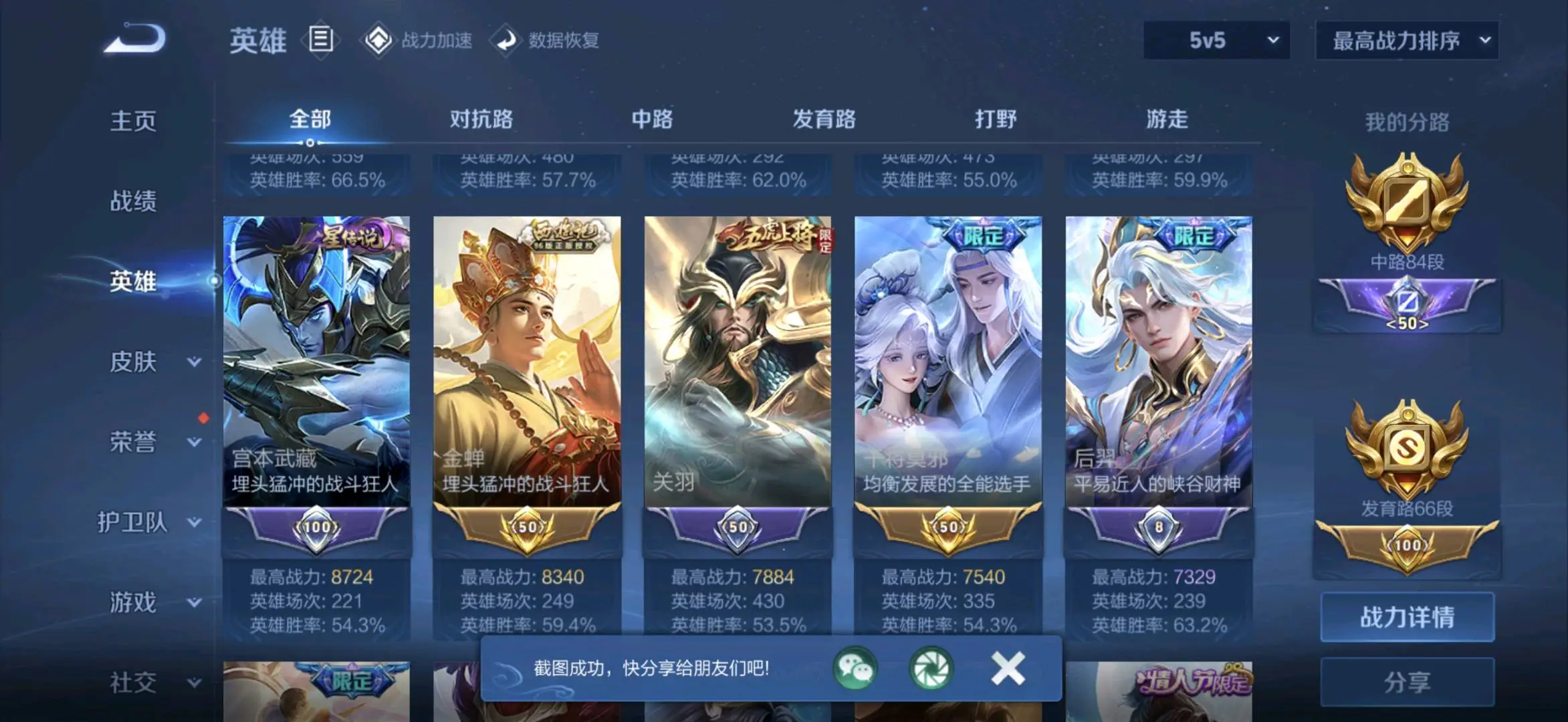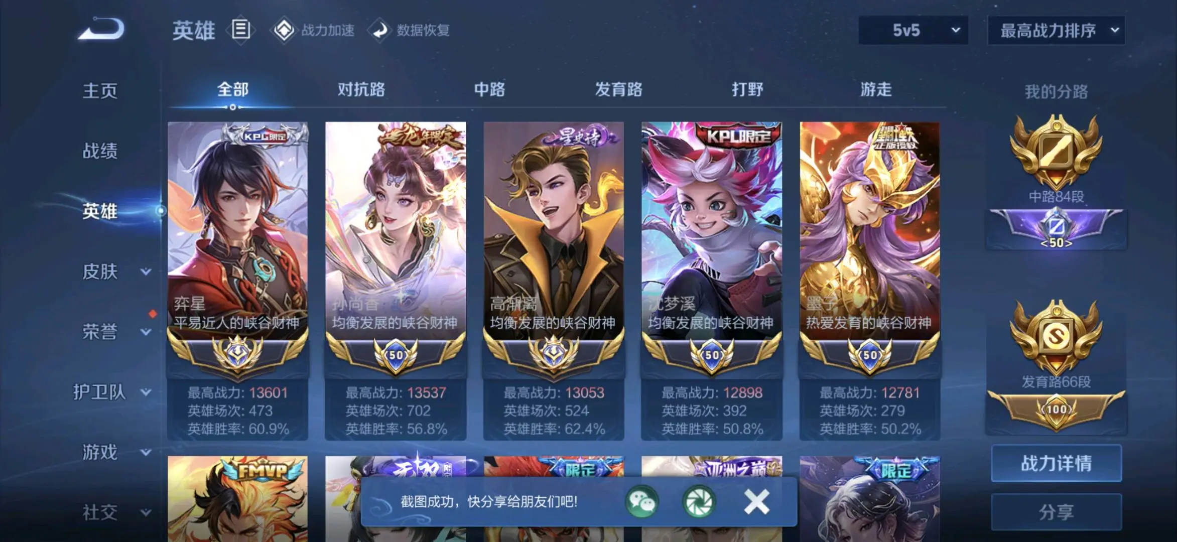 贵族等级V10无双贵族,英雄数量129,典藏皮肤数8,皮肤数量755,冰锋战神/街头霸王/纯白花嫁/天魔缭乱/至尊宝/真爱至上/王者之锤/凤求凰/热情桑巴/逐梦之影/武陵仙君/神奇女侠/梅西/黄金狮子座/一生所爱/大圣娶亲/冰霜恋舞曲/青龙志/白虎志/朱雀志/太华/久胜战神/飞衡/梁祝/倪克斯神谕/白鹤梁神女/匿光追影者/鸣剑·曳影/遇见胡旋/龙胆/李逍遥/武圣/奔雷神使/孙行者/玉兔公主/补天/异界灵契/神威/启示之音/傲雪梅枪/淬星耀世/时雨天司