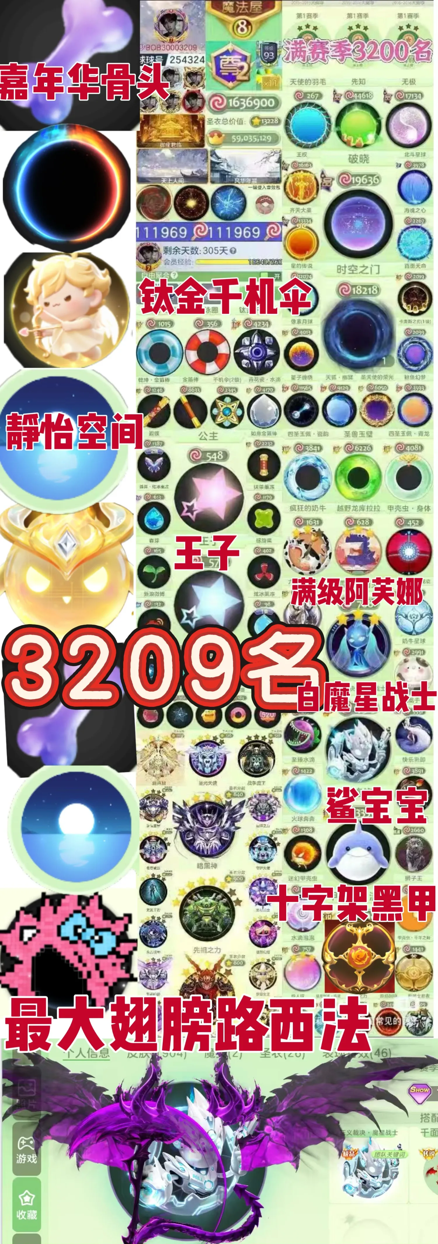 【全平台】 顶配三千排名❤满赛季❤满级阿芙娜❤路西法幻化超大翅膀❤静谧空间王子时空之门鲨饱饱白魔星战士泳圈甲壳虫