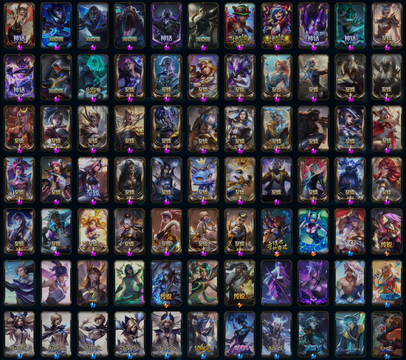 【传说皮肤】符文战熊沃利贝尔 丧尸布兰德 驯龙学者黑默丁格 西部天使艾希 战地机甲厄加特 黎明使者索拉卡 约德尔国队长提莫 铁哥们儿奥拉夫 地狱之门卫士加里奥 枯萎之壤泽拉斯 暗星女王拉克丝 女帝卡特琳娜 血石领主弗拉基米尔 女主播迦娜 神拳李青 神龙尊者圣龙李青 战地巨兽科加斯 神王德莱厄斯 女警狙击凯特琳 星之守护者拉克丝 腥红之月鬼武姬阿卡丽 宇航员诺提勒斯 冰霜之刃艾瑞莉娅 霸天异形卡兹克 黯晶凤凰艾尼维亚 黎明使者锐雯 提莫约德尔人的一大步 恶魔男爵瑞兹 神龙尊者夜月幻龙亚索 西部魔影卢锡安 律政大亨蒙多 神龙尊者昼日真龙亚索 黑夜使者亚索 绅士科加斯 未来战士凯特琳 泳池派对吉格斯 最终BOSS维迦 真实伤害艾克 金牌主播德莱文 欧米伽小队幽灵特工 地狱行者孙悟空 烈焰雄心崔丝塔娜 合金巨兽努努和威朗普 炼狱魔犬内瑟斯 奥德赛凯隐 霸天零式赛恩 恶魔之刃泰达米尔 电玩女神娑娜 源计划净化薇恩 银河魔装机神兰博 源计划联合艾希 天煞劫 双重冰晶艾尼维亚 星之守护者金克丝 女皇艾希 魔女伊芙琳 第三类接触黑默丁格 鬼魂新娘莫甘娜 战斗学院凯特琳 焰尾妖狐阿狸 冰霜亚龙希瓦娜 灌篮高手德莱厄斯