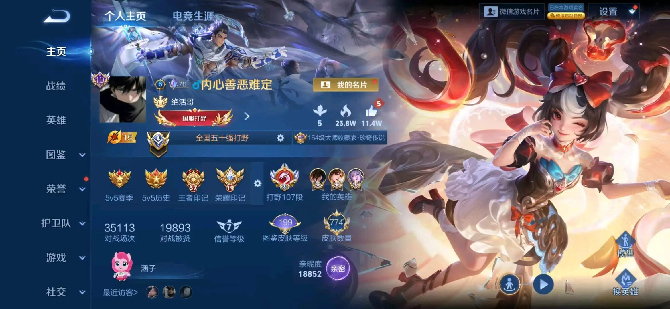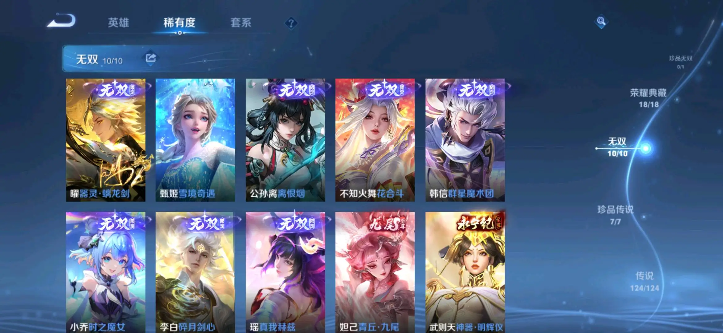 贵族等级V10无双贵族,英雄数量129,典藏皮肤数20,皮肤数量777,冰锋战神街头霸王天鹅之梦纯白花嫁天魔缭乱至尊宝杀手不太冷真爱至上圣诞老人王者之锤大秦宣太后凤求凰热情桑巴逐梦之影武陵仙君神奇女侠星空梦想梅西无限飓风号黄金狮子座一生所爱全息碎影大圣娶亲冰霜恋舞曲青龙志白虎志朱雀志活力突击太华久胜战神飞衡梁祝倪克斯神谕白鹤梁神女匿光追影者鸣剑·曳影遇见胡旋龙胆星域神启李逍遥武圣奔雷神使孙行者玉兔公主补天异界灵契神威启示之音傲雪梅枪淬星耀世时雨天司
