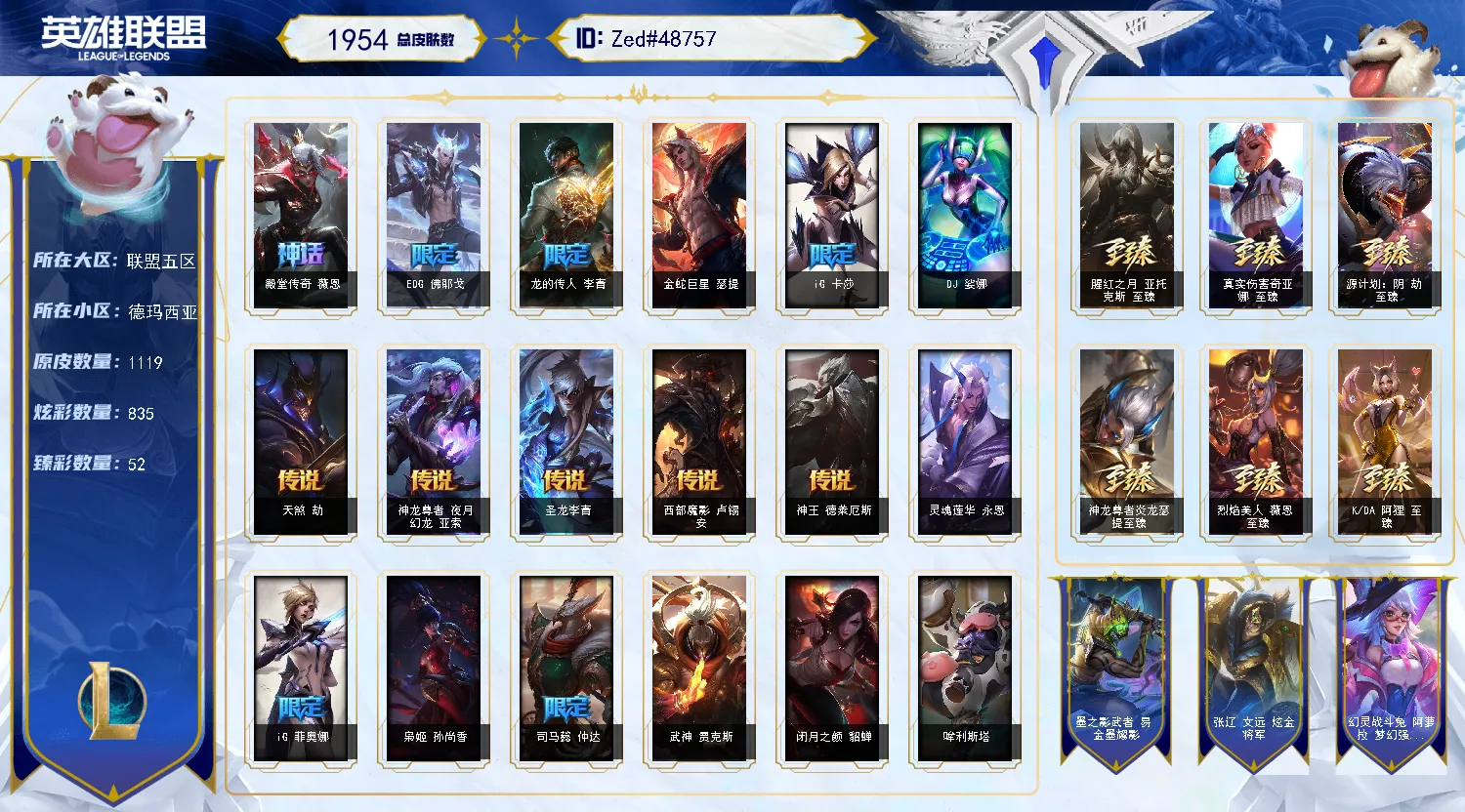 【联盟五区】1943皮丨73神话丨3氪金皮丨圣堂腕豪丨西部炽天使永恩丨灭世天煞劫丨兔年刀妹丨新龙虾