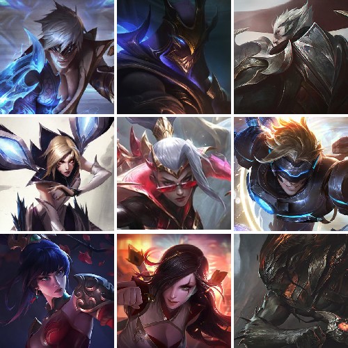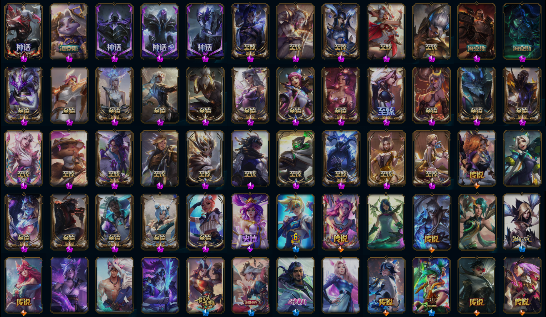 【传说皮肤】魔女伊芙琳 影执事劫 源计划毁灭派克 西部天使赛娜 驯龙学者黑默丁格 日蚀骑士希维尔 神王盖伦 光明哨兵格雷福斯 女帝卡特琳娜 光明哨兵薇恩 灵魂莲华阿狸 邪鸦魅影乐芙兰 黎明使者锐雯 铁哥们儿奥拉夫 合金巨兽努努和威朗普 焰尾妖狐阿狸 战地机甲厄加特 至尊魔女莫甘娜 地狱行者孙悟空 源计划泯灭雷克顿 西部天使艾希 烈焰雄心崔丝塔娜 黑夜使者亚索 青花瓷伊泽瑞尔 真实伤害艾克 暗星尊烬 神龙尊者圣龙李青 冰霜亚龙希瓦娜 苹果机器人布里茨 星之守护者金克丝 符文战熊沃利贝尔 战场女武神凯尔 鬼魂新娘莫甘娜 地狱之门卫士加里奥 腥红之月鬼武姬阿卡丽 最终BOSS维迦 金牌主播德莱文 天煞劫 神拳李青 血石领主弗拉基米尔 神王德莱厄斯 幻灵战斗队长厄运小姐 冰霜之刃艾瑞莉娅 枯萎之壤泽拉斯 提莫约德尔人的一大步 电玩女神娑娜 女皇艾希 恶魔男爵瑞兹 红色男爵库奇 魔幻卡牌崔斯特 绅士科加斯 死亡骑士盖伦 钢铁军团盖伦 黯黑魔龙希瓦娜 陆地王者4WD布里茨 星之守护者卡莎 黯晶凤凰艾尼维亚 双重冰晶艾尼维亚 女警狙击凯特琳 星之守护者拉克丝 偶像歌手阿狸 女主播迦娜 大天使长米迦勒凯尔 约德尔国队长提莫 霸天异形卡兹克 第三类接触黑默丁格 女校长菲奥娜 星之守护者霞 泳池派对吉格斯 驯龙炮手崔丝塔娜 未来战士凯特琳 炼狱魔犬内瑟斯 屠龙勇士潘森 冰川巨兽墨菲特 源计划林易 源计划联合艾希 苍穹之光韦鲁斯