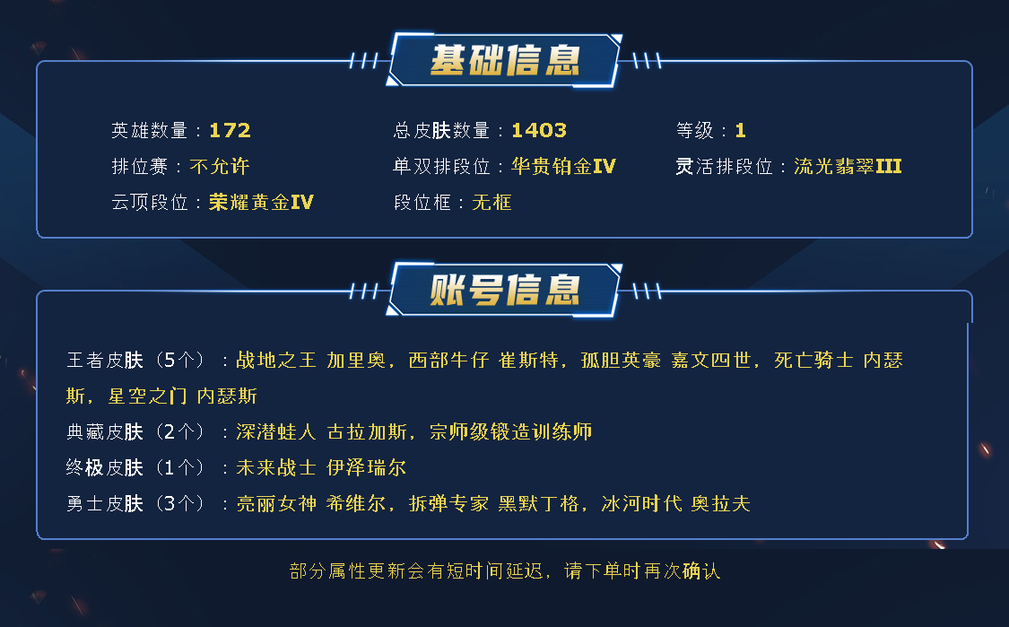 ~~喜欢记得收藏~~可排位~~1400皮全英雄~~租之前尽量查一下游戏ID,确保段位是您需要的,避免浪费您的时间~~请勿挂机逃跑故意送人头,谢谢合作,谢谢~~