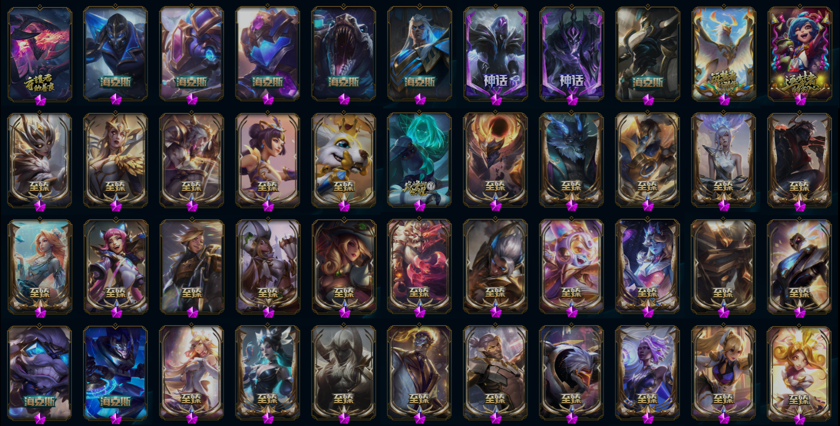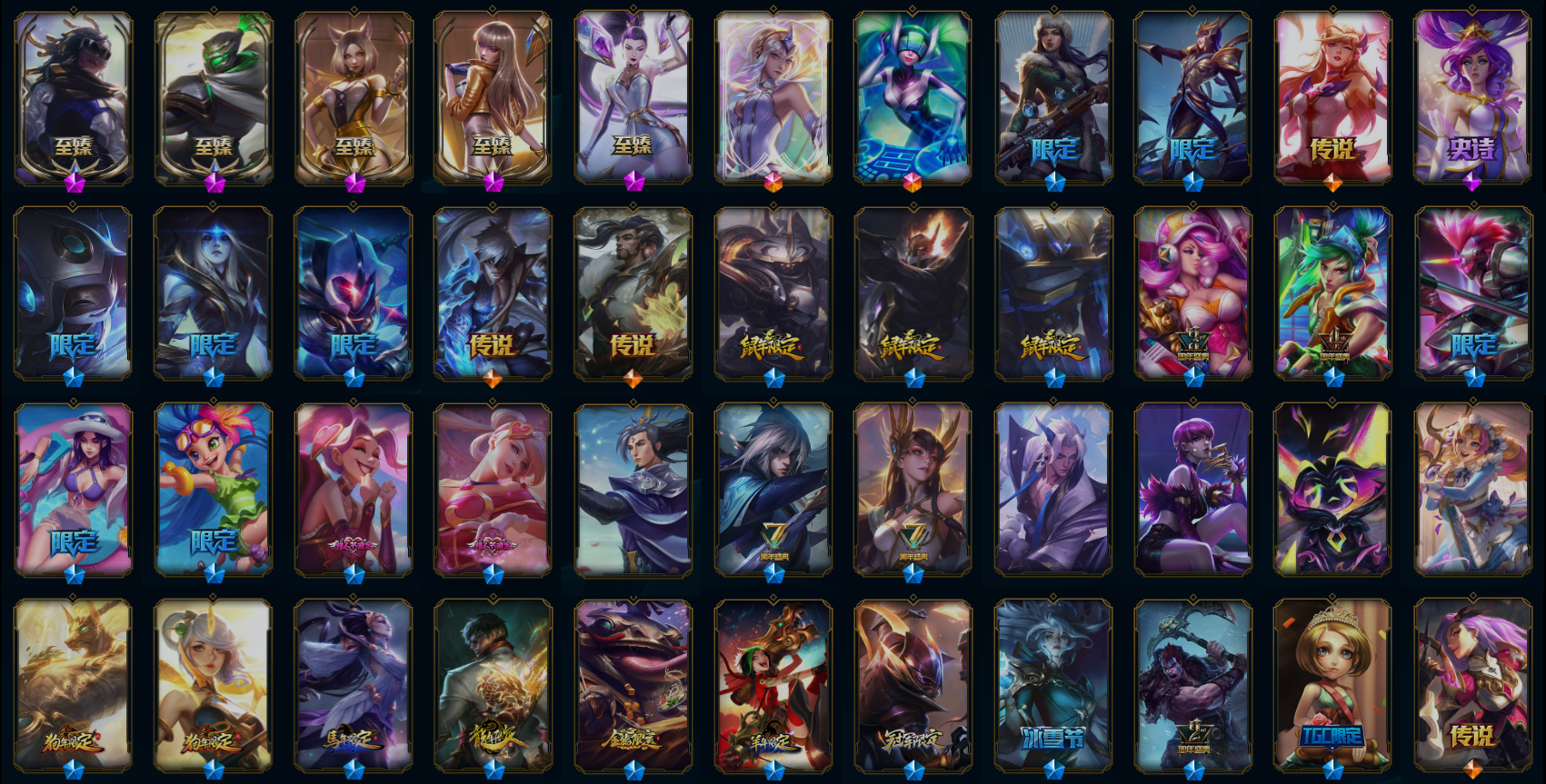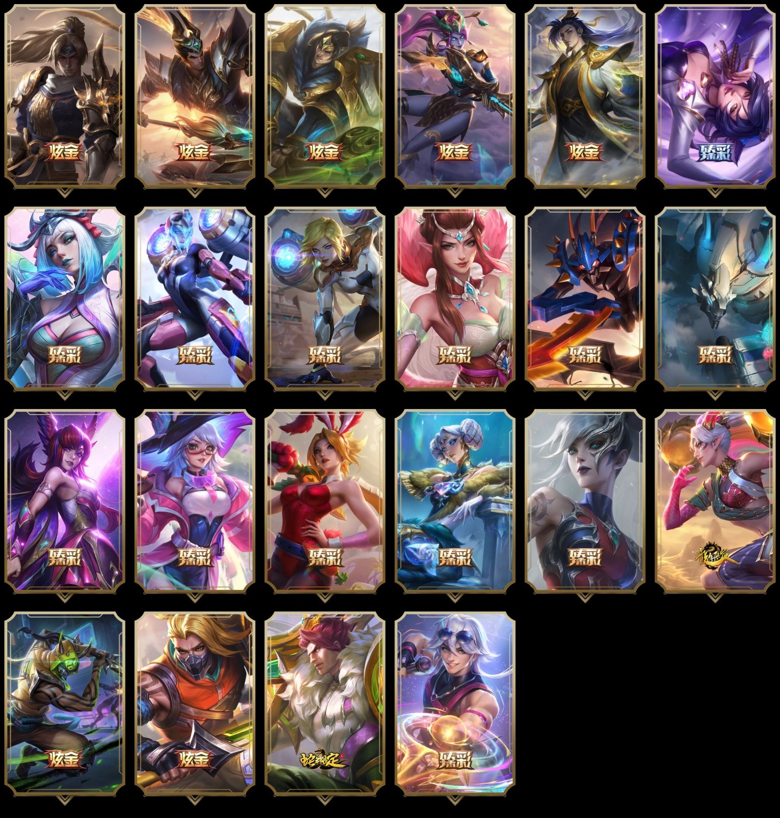 【重要皮肤】北极星使者沃里克至臻 太空律动魔音海妖娜美至臻 海珀利安小队X09星环灵风迦娜至臻 星之守护者辛德拉至臻 海之歌萨勒芬妮至臻 西部魔影猎天使恶魔泰隆至臻 月蚀骑士赛娜至臻 幻灵战斗猫金克丝至臻 青花瓷拉克丝至臻 魅惑女巫莫甘娜至臻 女帝黛安娜至臻 战斗学院蕾欧娜至臻 太空律动璐璐至臻 魔女婕拉至臻 魔女乐芙兰至臻 真实伤害赛娜至臻 星之守护者索拉卡至臻 灵能特工伊泽瑞尔至臻 源计划逆流塞拉斯至臻 源计划阴劫至臻 王国机神玄武盖伦至臻 暗星墨菲特至臻 神龙尊者炎龙瑟提至臻 神龙尊者均衡之龙沃利贝尔至臻 征服者贾克斯至臻 飞升战神潘森至臻 焰执事布兰德至臻 KDA二代卡莎至臻 KDA一代卡莎至臻 KDA阿狸至臻 KDA阿狸2022至臻 魅惑女巫厄运小姐至臻 星之守护者妮蔻至臻 星之守护者妮蔻2022至臻 绒毛菲兹至臻 绒毛菲兹2022至臻 腥红之月亚托克斯至臻 腥红之月亚托克斯2022至臻 未来战士锤石至臻 未来战士锤石2022至臻 灰烬骑士派克 灰烬征服者潘森 海克斯科技安妮 海克斯科技雷克顿 海克斯科技克格莫 海克斯科技斯维因 海克斯科技吉格斯 海克斯科技嘉文四世 海克斯科技阿木木 海克斯科技拉莫斯 暗星科加斯 零之枪骑赫卡里姆 冰原狙击凯特琳 舞会公主安妮 创星之灵璐璐 钢铁军团拉克丝 养蜂人辛吉德 暗黑灵魂阿利斯塔 勇敢的心德莱厄斯 电玩女神厄运小姐 电玩勇者锐雯 玉剑传说无影 玉剑传说舞剑仙 龙的传人李青 龙腾虎跃瑟提 招财进宝提莫 神龙烈焰金克丝 春晖神女拉克丝 北辰之威内瑟斯 南天之怒沃里克 美猴王孙悟空 玉净夜叉凯特琳 紫金罗刹莫甘娜 广寒仙子嫦娥 虎痴之拳蔚 张辽文远 司马懿仲达 纳财大帝塔姆 醒狮克格莫 王国机神青龙德莱文 王国机神白虎贾克斯 王国机神玄武盖伦 胜利之树茂凯 胜利女神奥莉安娜 胜利枪神格雷福斯 胜利枪神卢锡安 胜利女神莫甘娜 胜利女神伊莉丝 碎心之拳蔚 甜心宝贝娑娜 觅心游侠卢锡安 觅心女王艾希 觅心之翼奎因 觅心萝莉金克丝 觅心猎手薇恩 北极星神黛安娜 寒冬精灵璐璐 冬季仙境奥莉安娜 雪球也能爆炸吉格斯 圣诞老人布隆 冰雪驯鹿波比 冰雪风暴希维尔 冬季仙境卡尔玛 冰封王子蒙多 冰雪女神辛德拉 魄罗骑士瑟庄妮 夺命美人卡特琳娜 平安夜女神娑娜 圣诞糖果棒厄运小姐 魅惑女巫厄运小姐 魅惑女巫莫甘娜 魅惑女巫崔丝塔娜 魅惑女巫奈德丽 灵魂收割者索拉卡 克烈古拉伯爵 勇敢的心德莱厄斯 泳池派对凯特琳 泳池派对佐伊 泳池派对普朗克 泳池派对塔莉垭 泳池派对厄运小姐 泳池派对菲奥娜 泳池派对格雷福斯 泳池派对李青 泳池派对蕾欧娜 泳池派对雷克顿 电玩战魂赫卡里姆 斩星魔剑易 御星魔矢艾希 创战纪希维尔 制胜金球拉莫斯 FPX李青 SSG纳尔 SSG嘉文四世 SKTT1辛德拉 SKTT1娜美 SKTT1艾克 SKTT1阿利斯塔 SKTT1卡莉丝塔 SKTT1阿兹尔 SKTT1雷克顿 SSW锤石 SSW雷恩加尔 SSW泰隆 SSW图奇 SSW辛吉德 SKTT1贾克斯 SKTT1劫 SKTT1婕拉 SKTT1李青 SKTT1薇恩 暗杀星奥莉安娜 暗杀星蒙多 暗杀星努努和威朗普 暗杀星伊泽瑞尔 暗杀星慎 Fnatic迦娜 Fnatic库奇 Fnatic古拉加斯 Fnatic卡尔萨斯 冰雪节玛尔扎哈 冰雪节辛吉德 冰雪兽纳尔 防暴机器人布里茨 防暴士兵格雷福斯 防暴士兵辛吉德 钢铁之翼艾尼维亚 冠军典狱长锤石 冠军之矛卡莉丝塔 冠军之刃锐雯2016 冠军之血希瓦娜 冠军之隐劫 冠军之志瑞兹 鬼影森森茂凯 鬼影重重魔腾 海贼瑞兹 红桃杰克崔斯特 胡桃夹子萨科 惊悚派对费德提克 蓝色忧郁崔斯特 蒙多蒙多 密林猎手提莫 南瓜头费德提克 女猎手希维尔 圣诞精灵崔丝塔娜 圣诞开心鬼提莫 圣诞狂欢基兰 圣诞狂欢努努和威朗普 圣诞老人古拉加斯 圣诞玩偶波比 圣诞驯鹿克格莫 糖果使徒费德提克 外星装甲库奇 无头骑士赫卡里姆 喜庆之树茂凯 邪恶圣诞老人维迦 幸福女神乐芙兰 雪默丁格 雪球也能爆炸吉格斯 雪装奈德丽 野兽猎人德莱文 野兽猎人瑟庄妮 野兽猎人泰达米尔 英勇玩具兵普朗克 永恒之森乐芙兰 勇者阿狸 勇者奈德丽 征服者卡尔玛 暗影沃里克 机械迷城加里奥 诺斯费拉图弗拉基米尔 阿木木主人不要我了 波比的巧克力工坊 地底世界崔斯特 都铎王朝图奇 十周年纪念安妮 源代码乐芙兰 神凰行者瑞羽圣凰艾尼维亚 DJ娑娜 大元素使拉克丝 灵魂守卫乌迪尔 武装战姬厄运小姐