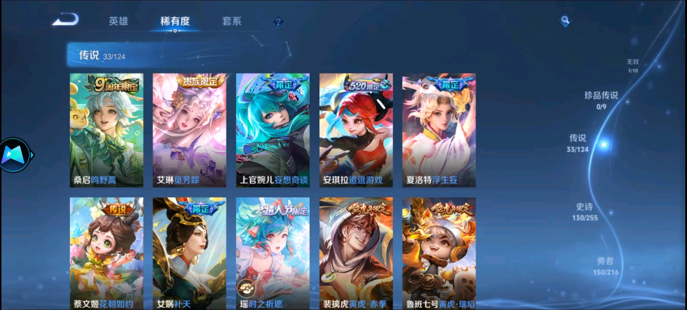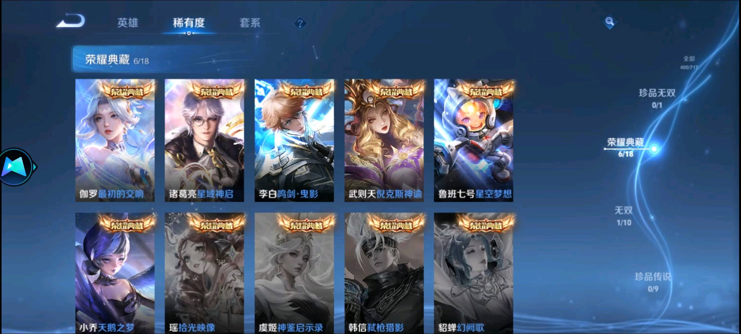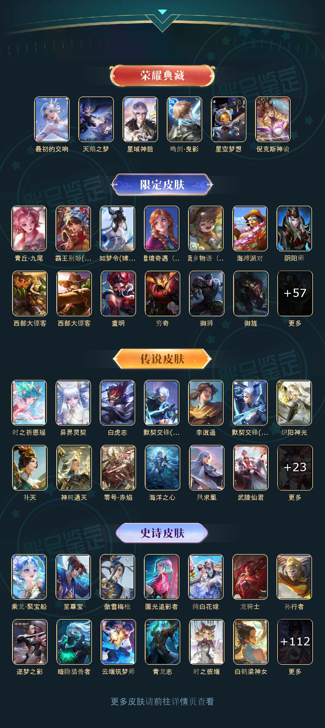贵族等级V10,英雄数量125,典藏皮肤数6,皮肤数量400,