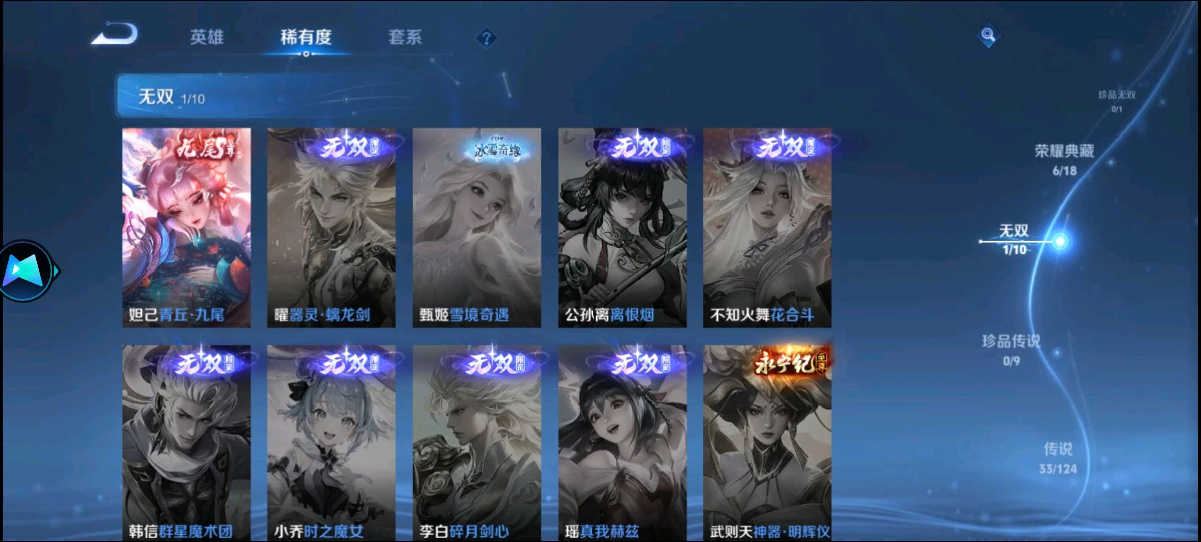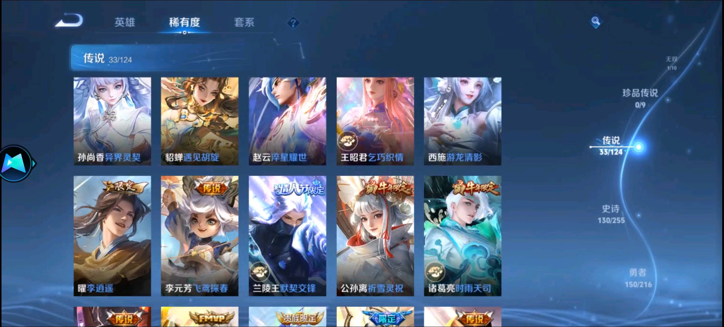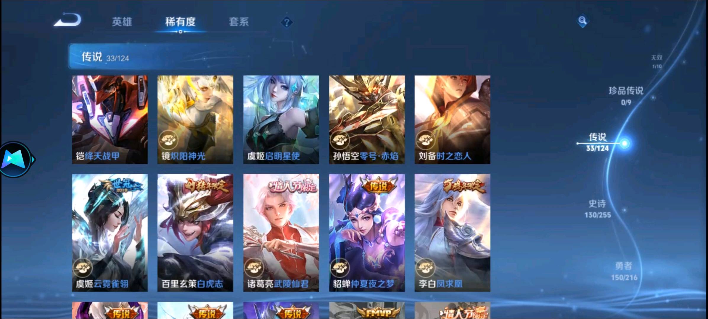 贵族等级V10,英雄数量125,典藏皮肤数6,皮肤数量400,