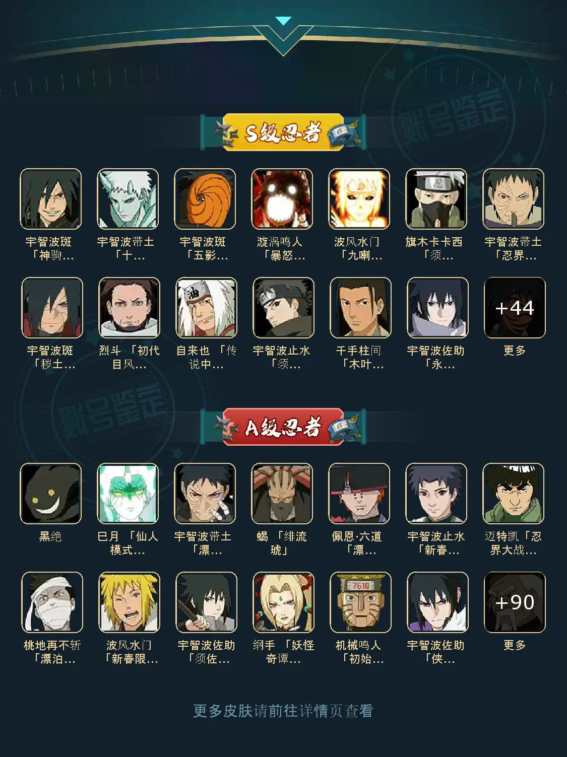 夏日黑土 仙人自来也 纲手 波风水门 百战水门 猿飞日斩 千手柱间 宇智波斑 宇智波鼬 舞之自来也 大蛇丸 百战大蛇 秽土四代 秽土三代 秽土长门 仙人兜 黄猿九喇嘛鸣人 紫狗永恒佐助 樱婊忍战樱 秽土鼬 普通自来也 百豪纲手 死门凯 二代扉间 秽土二代 秽土初代 秽土柱间 白面具 须佐卡卡西 小胡子鬼灯幻月 雷影 土影 无 佩恩 百战佩恩 青年柱间 创立初代 秽土斑 青年斑 解斑 须佐止水 虎皮 破面带土 红夜带土 罗砂 秽土三代风影 忍战雷影 三代雷影 金角银角 秽土半藏 忍战大野木 小土豆 天道超 大筒木桃式 大筒木金式 钢铁之躯凯 桀骜之刃阿斯玛 狂野之鲨鬼鲛 飞段 新春大蛇丸 黑飞段 百豪樱 忍战李 大卡卡西 五代水影照美冥 宇智波鼬 仙鸣 九尾查克拉鸣人 鹰佐 奇拉比 青年艾 半蛇兜 晓蛇 新春鼬 面麻 须佐佐助 疾风咒印佐助 忍战宁次 忍战天天 最终章雏田 幻容卡卡西 神卡 忍战卡卡西 泳装卡卡西 忍战凯 青春哥 惊门凯 爱情哥 新春止水 新春水门 青年水门 青水 新春我爱罗 泳装照美冥 侠隐照美冥 侠隐纲手 侠隐兜 漂泊再不斩 漂泊佩恩 漂泊二代 漂泊小南 漂泊佩恩 三船 青年三船 青年长门 泳装南 新春南 晓创生角度 晓创生蝎 晓创生飞段 泳装鼬 鲛肌融合鬼鲛 新春迪达拉 秽土迪达拉 恶灵之影飞段 暴怒带土 忍战黄土 卑留呼 桃博 黑土