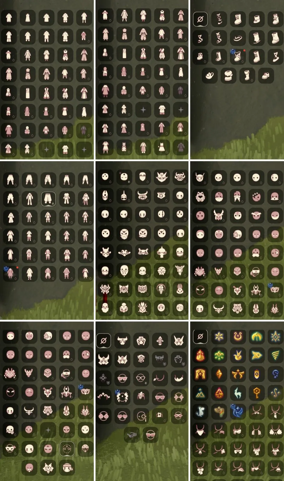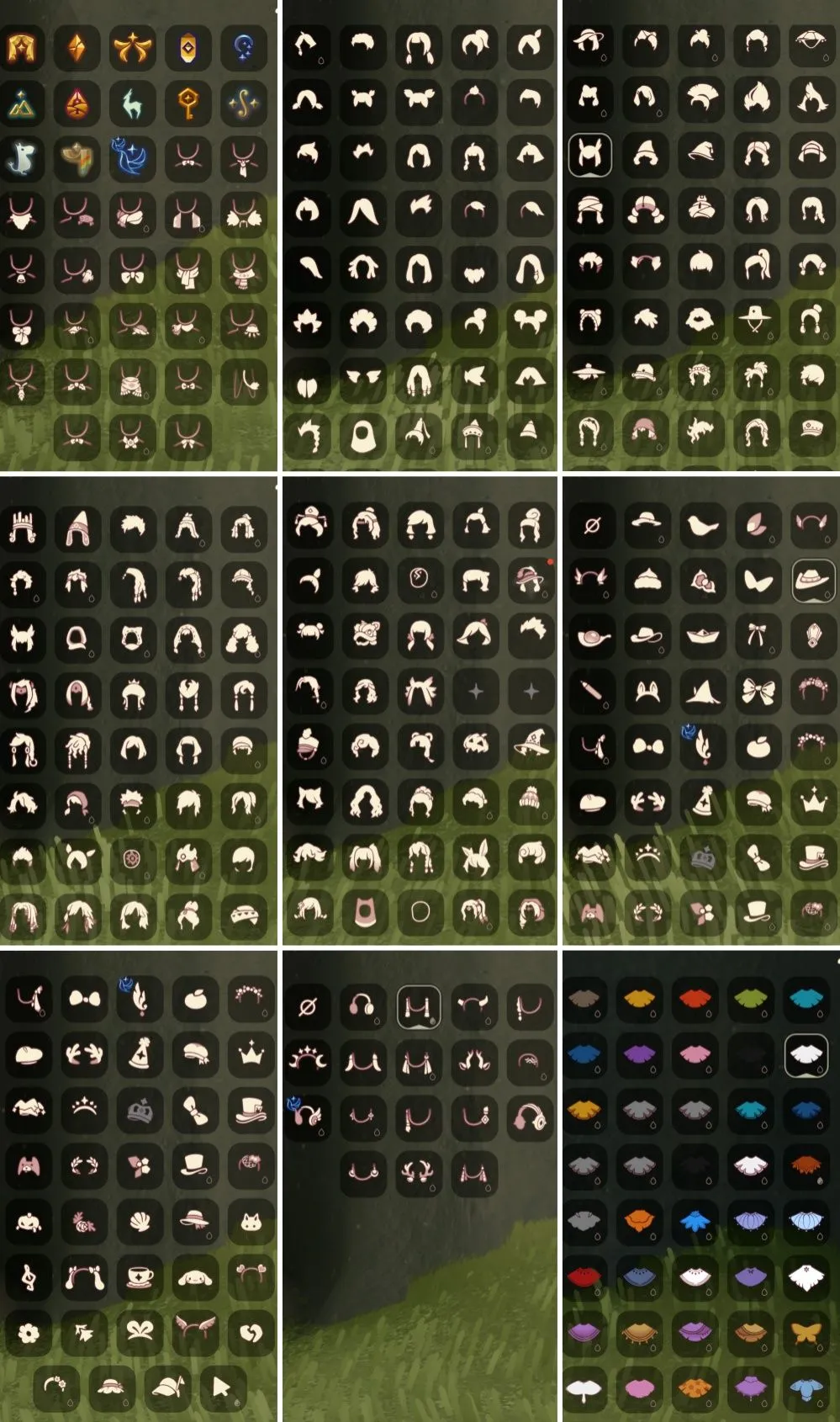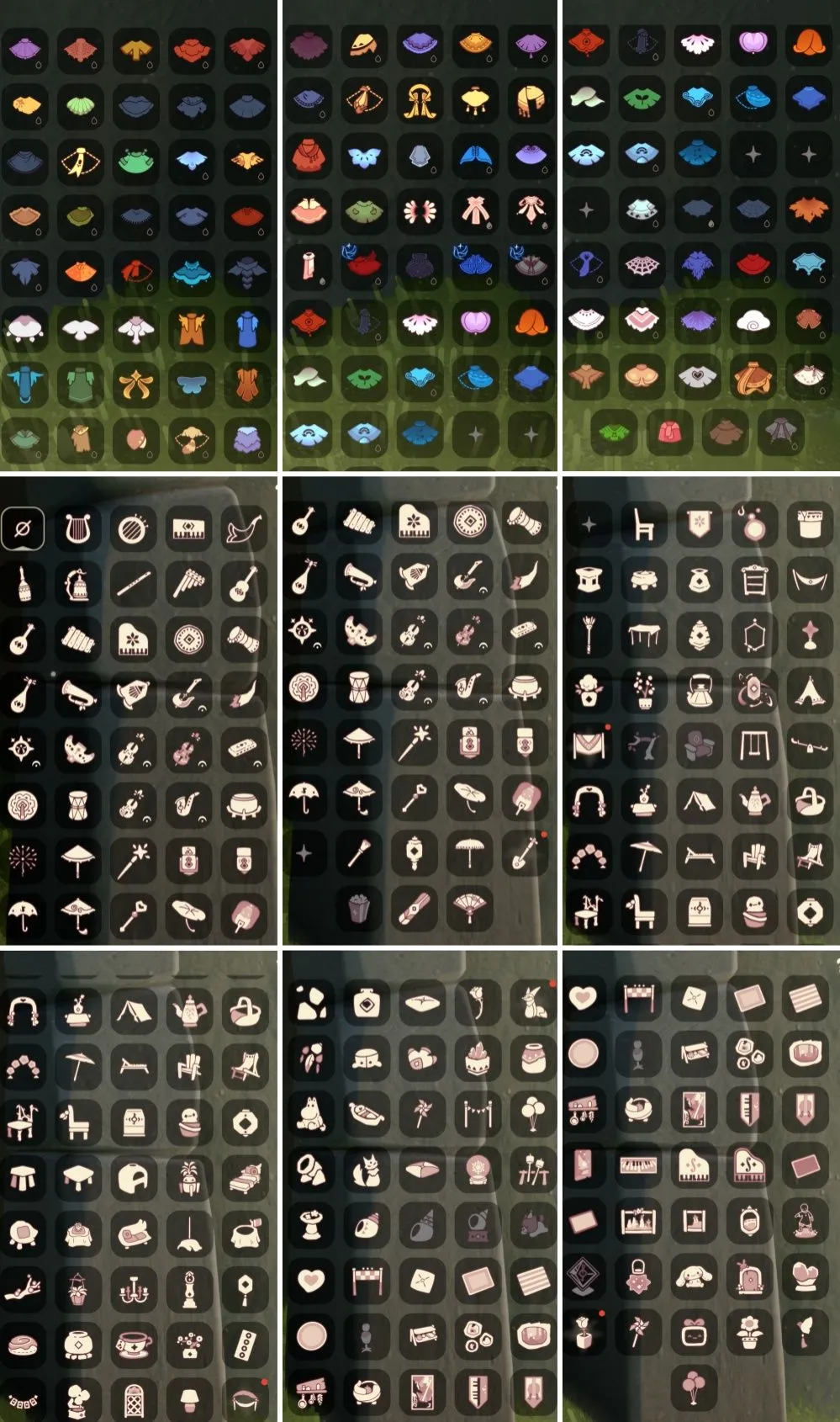 礼包:远行服饰,挚爱装扮,月华套装,牛仔裤,优雅三件套,爱丽丝套装,KFC厨师,连衣裙,玉兔拖鞋,雪人靴,史力奇套装,祥云服饰,龙鳞束身,火焰墨镜,爱心墨镜,树精肩饰,优雅领巾,水母肩饰,姆明饰品,有友帽子,远行发型,福娃套装,海洋发型,蝙蝠套装,巫师帽,双马尾发型,大耳狗发饰,绊爱套装,风之旅人,小橘子,小狗头饰,锦标赛桂冠,小兔子,贝壳头饰,心相印发饰,大耳狗头饰,星月头饰,神鹿鹿角,龙鳞耳坠,彩虹耳饰,彩虹耳机,满月耳坠,鹿角,小王子斗篷,星球夹克,欧若拉之翼,奉献斗篷,莲花斗篷,妮妮斗篷,线框斗篷,遥鲲披肩,蜘蛛斗,皮皮猫斗,蛛丝斗篷,鸦羽斗篷,雪花斗,白绒斗,保人斗,流星斗,大耳狗斗篷,文雀斗篷,飞蛾斗篷,倾福献瑞,粽叶斗,欧若拉之声,凯旋提琴,祥云纸伞,惊喜手杖,荷叶伞,灯笼,夏日阳伞,献瑞折扇,秋千,跷跷板,花憩茶桌,小憩茶桌,野餐篮,音桌,狐狸背包,小船,皮皮猫,水晶球,篝火点心,自然之声,大耳狗抱枕,大铁头