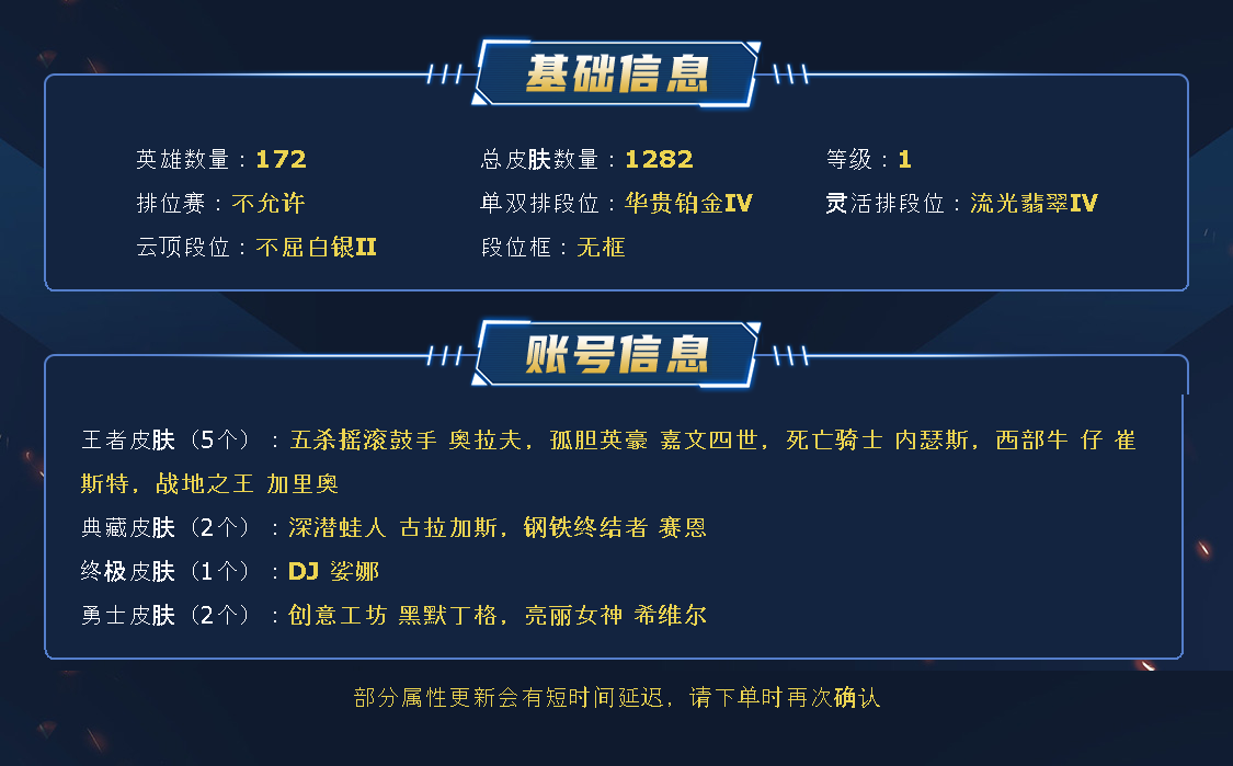 ~~喜欢记得收藏~~可排位~~1271皮全英雄~~租之前尽量查一下游戏ID,确保段位是您需要的,避免浪费您的时间~~请勿挂机逃跑故意送人头,谢谢合作,谢谢~~