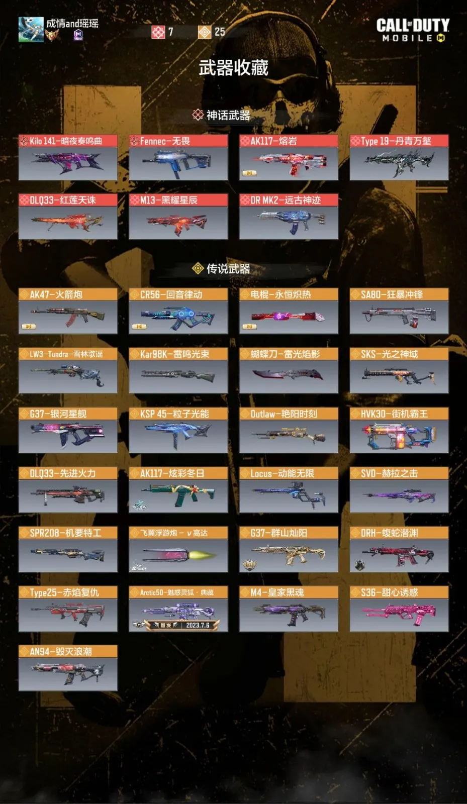 7神话武器,4典藏武器,21传说武器,303史诗武器;神话武器:LW3-Tundra-离散单元,Oden-神圣惩戒,FFAR1-无境空刃,Krig6-冰霜巨龙,Type19-丹青万壑,XM4-天策含光,AK117-熔岩;典藏武器:Arctic50-魅惑灵狐·典藏,SMG5-月光追痕·典藏,50GS-路阻且长·典藏,HVK30-街机霸王·典藏;传说武器:LW3-Tundra-雪林歌谣,XPR50-精灵咏叹,Arctic50-青眸白虎,DLQ33-先进火力,AMR-龙魄,HVK30-街机霸王,Locus-动能无限,SVD-赫拉之击,SMG5-月光追痕,50GS-路阻且长,DLQ33-炫彩冬日,拳套-魔羊利角,AK47-火箭炮,Dobvra-凛冬,SMG5-会心一击,Arctic-魅惑灵狐,长枪-涯角,MW11-逝火