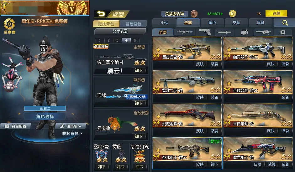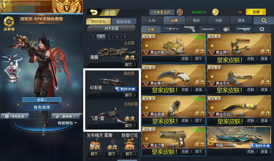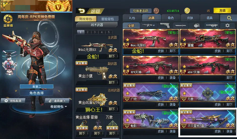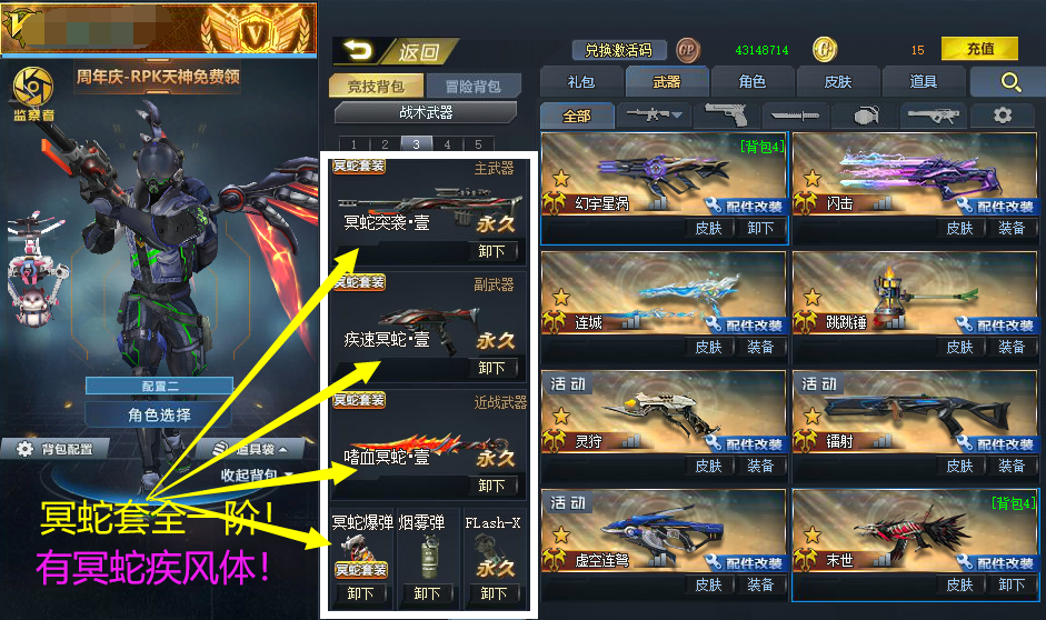 冥蛇疾风体!金蛇无限ex!血魔!棱晶!RPK+AK天神!广陵!狮心王•金盾!皇家皮肤!不灭壹!飞星壹