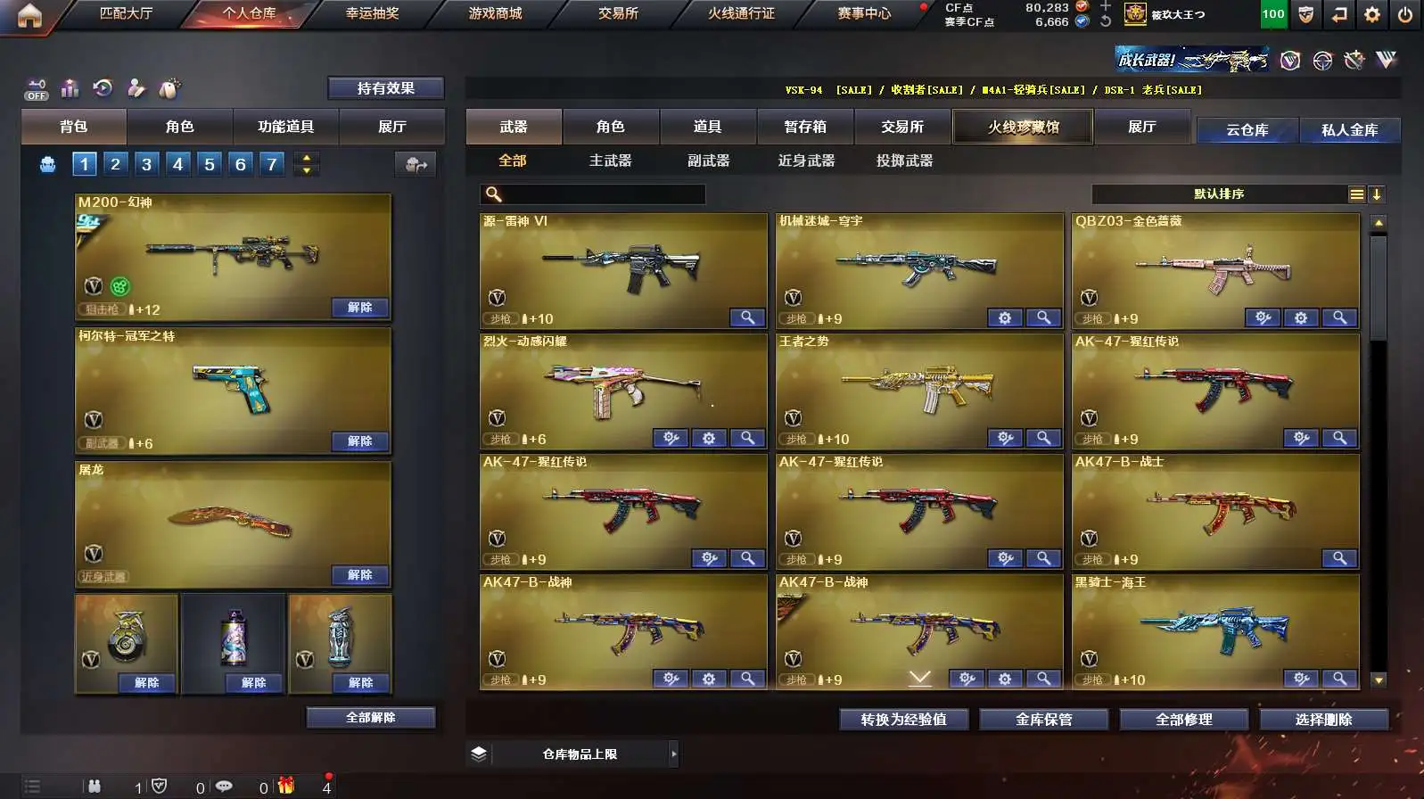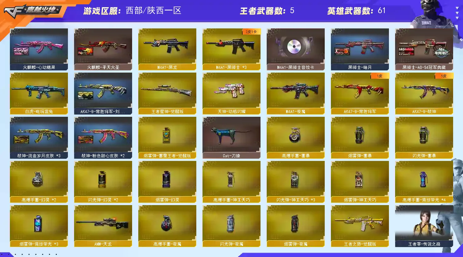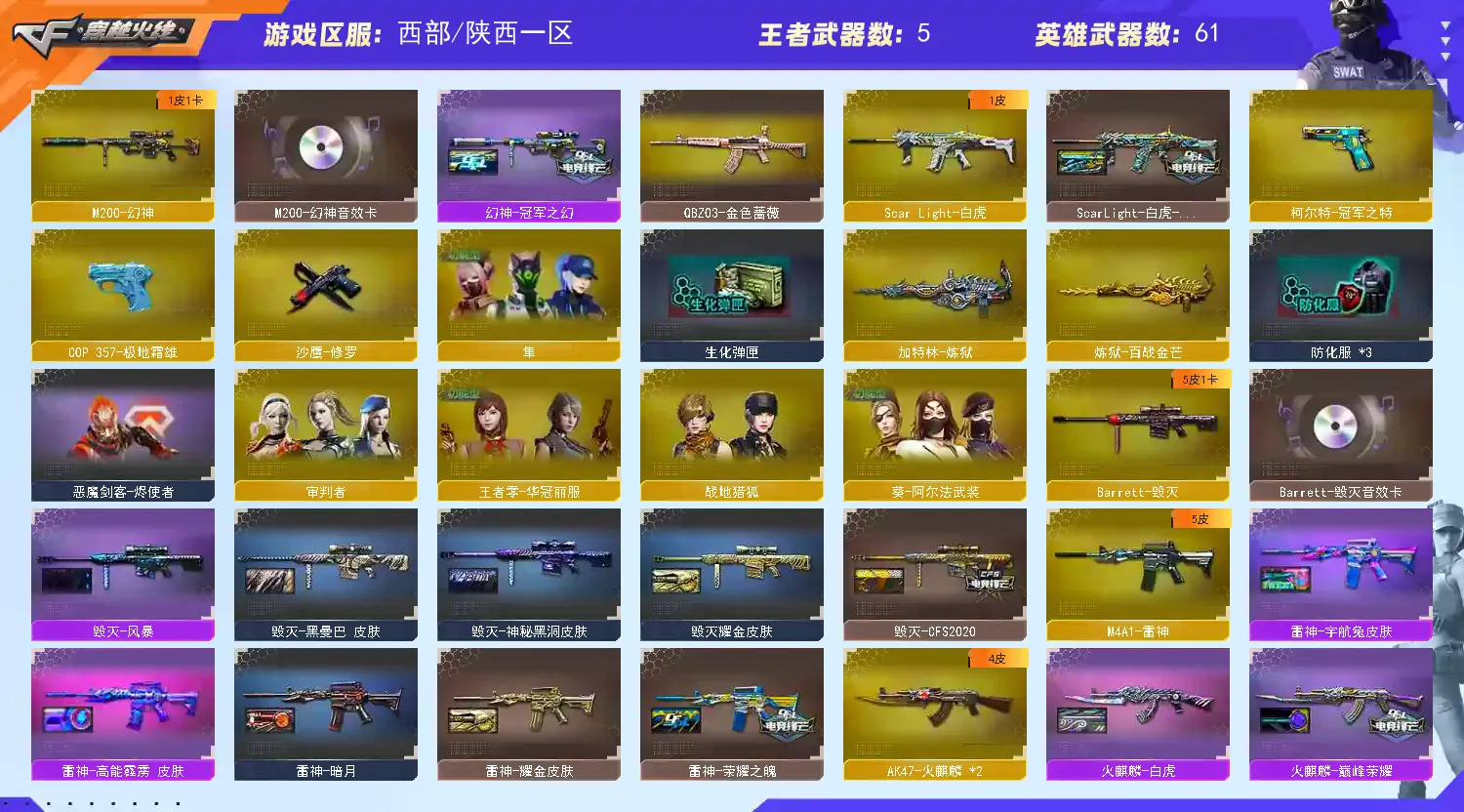 《m200幻神+幻神冠军之幻+幻神音效卡》《王者星神》《柯尔特冠军之特 1911大黄蜂》《白虎电玩蓝兔》《白虎》《qbz金色蔷薇》《王者之势》《毁灭》《火麒麟》《雷神》《黑骑士》《黑龙》《天龙曼陀罗》《隼 奇洋探员 乔伊教练满配 云海玲珑满配 王者零华冠丽服 灵动武士 职业选手》《xrock炫彩背包 超级背包 虎牙炫彩背包》《黑骑士音效卡 毁灭音效卡》《雷神高能霹雳 无影神兵利器 火麒麟白虎 火麒麟巅峰荣耀 死神机甲核心 雷神宇航兔 毁灭cfs2018 雷神荣耀之魄 白虎冠军之虎 毁灭cfs2020》