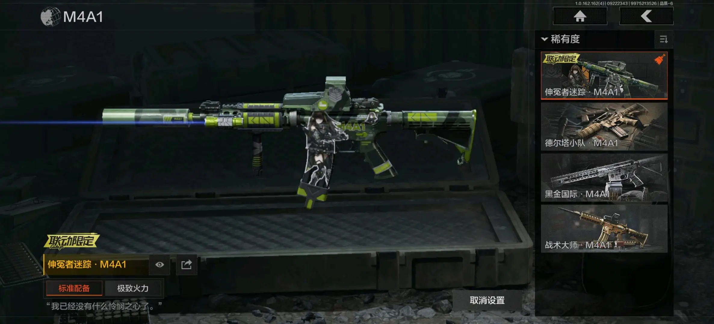 :伸冤者迷踪M4A1,蓝色咆哮H416,战术大师AK102,冬夜AK12,和平之手FAL,缟兵玄墨AKM,来战AKM,德尔塔小队M4A1,黑金国际M4A1,自喷网格H416,北国内卫MDR,竞技AUG,火绒草AUG,来战AK74N,山地伪装AK74N,骑士之剑AKS74U,雪山之王F2000,炎夏浪花AR57,涂绘猎人AR57,战术大师AR57,骑士之剑ACE31,湖冰倒影ACE31,靶场潮流SCAR,狂怒荣耀AEK,北国内卫AN94,靶场潮流AN94,阴影AN94,彻甲铜斑T951,缟兵玄墨T03,玄戈梨花T03,彻甲铜斑T03,07式林地迷彩QBZ191;