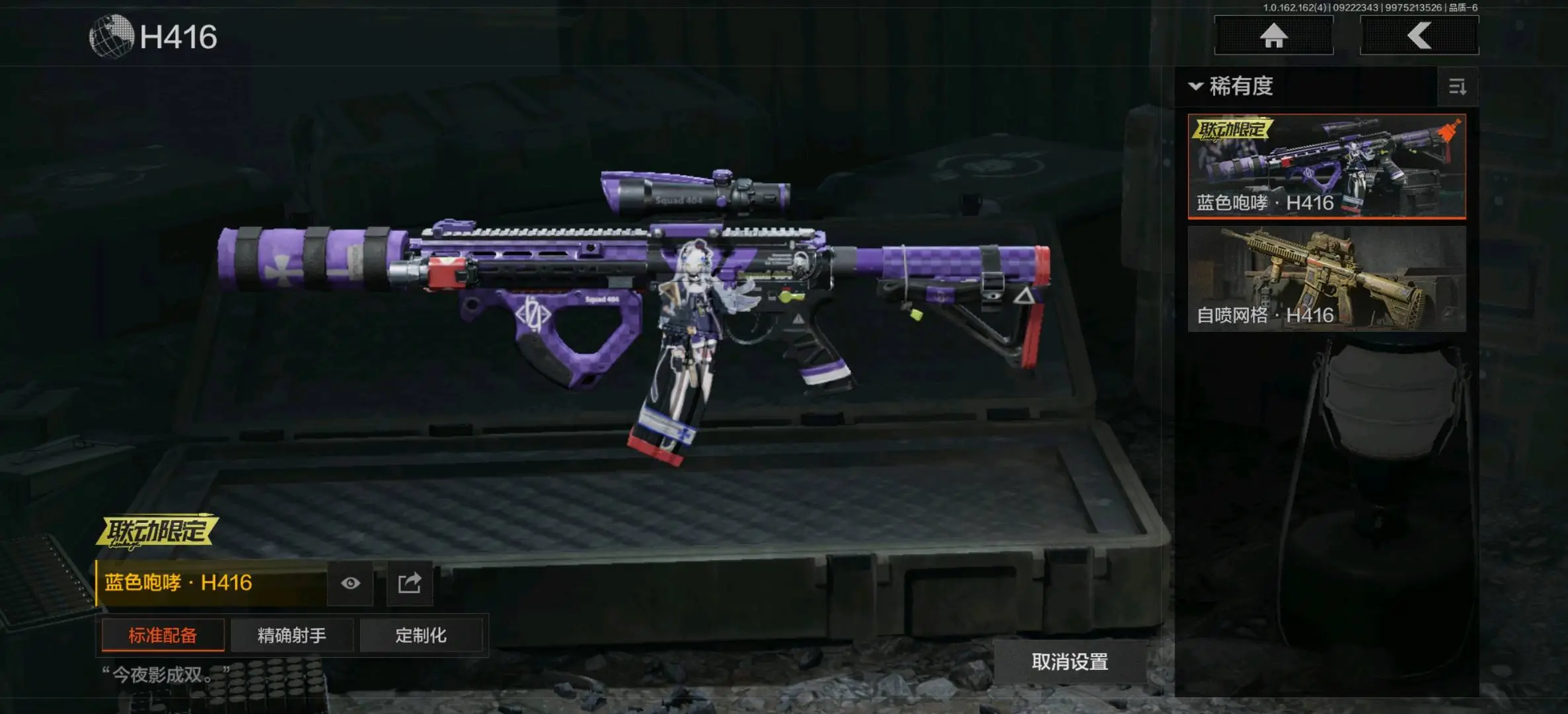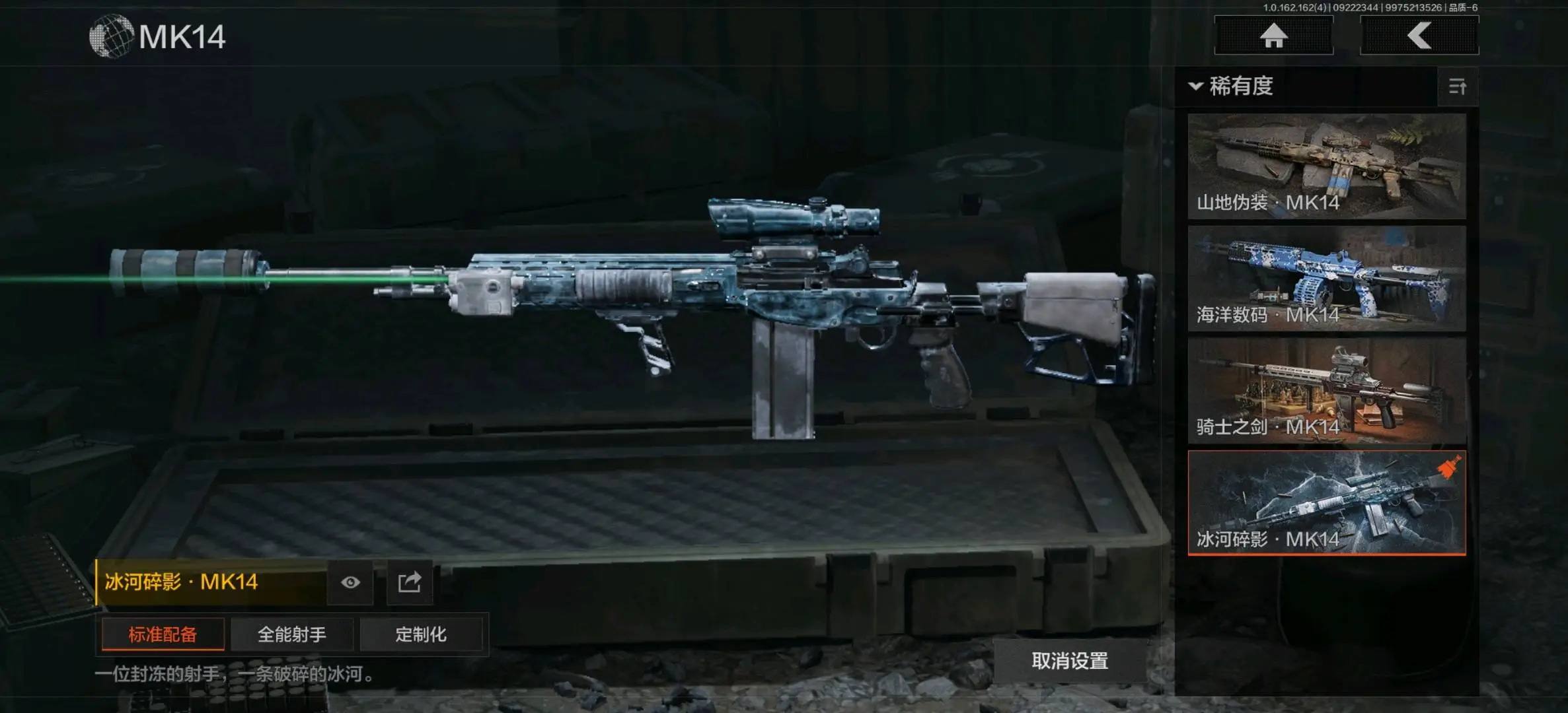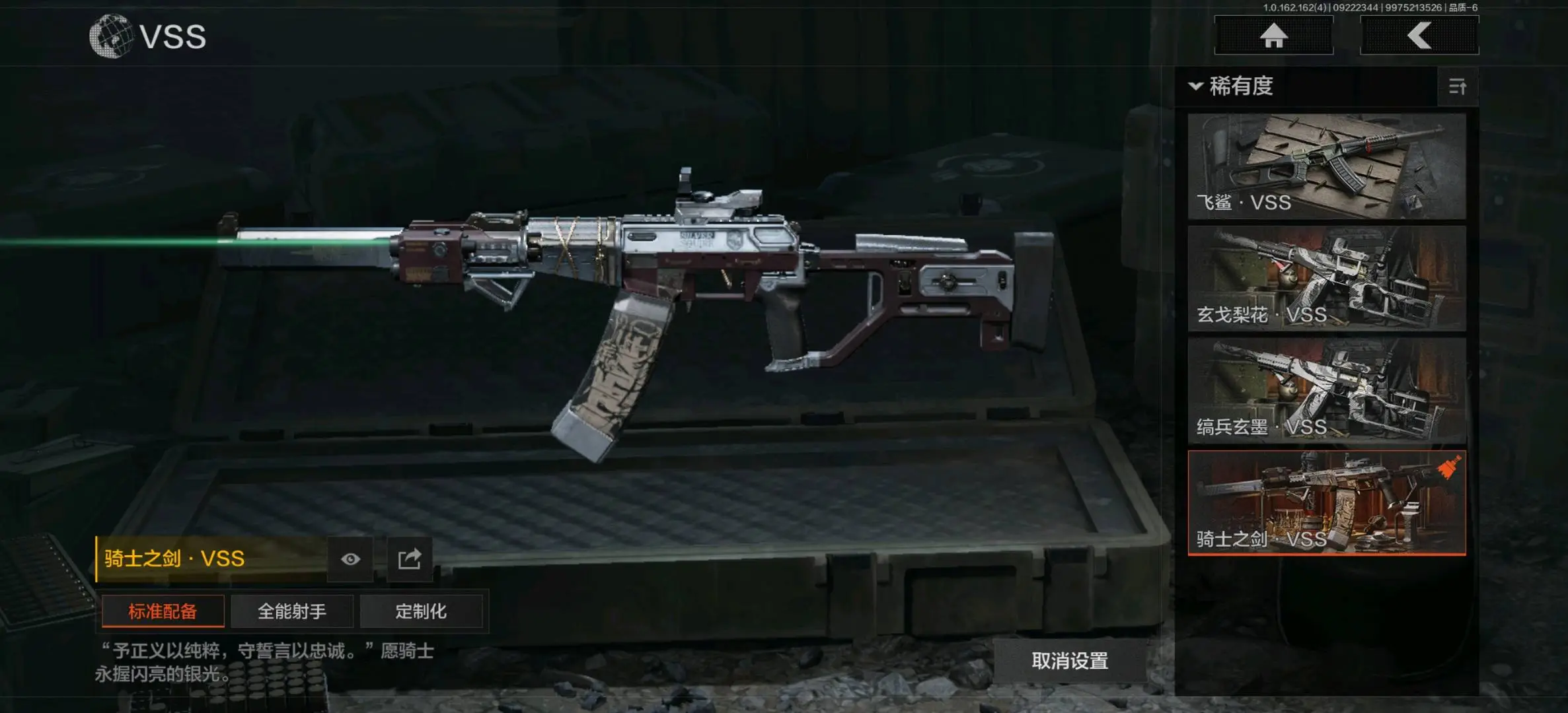 :骑士之剑VSS,冰河碎影MK14,缟兵玄墨VSS,玄戈梨花VSS,骑士之剑MK14,伦琴计量M110,缟兵玄墨M110,玄戈梨花M110,全地形数码M110;