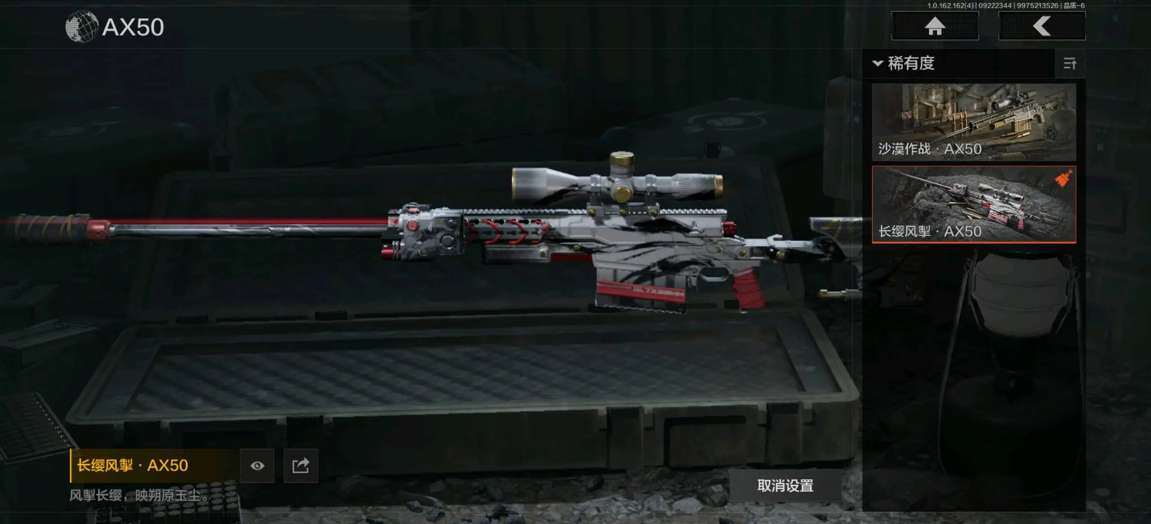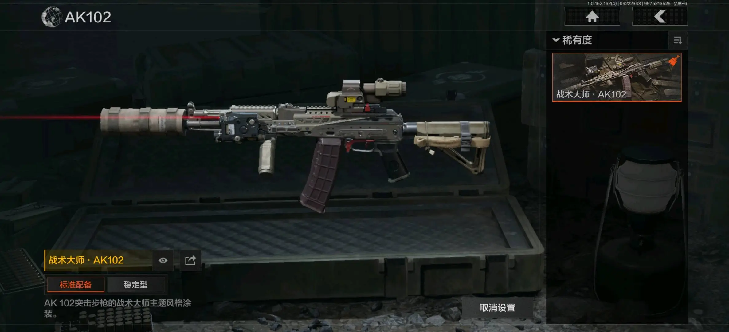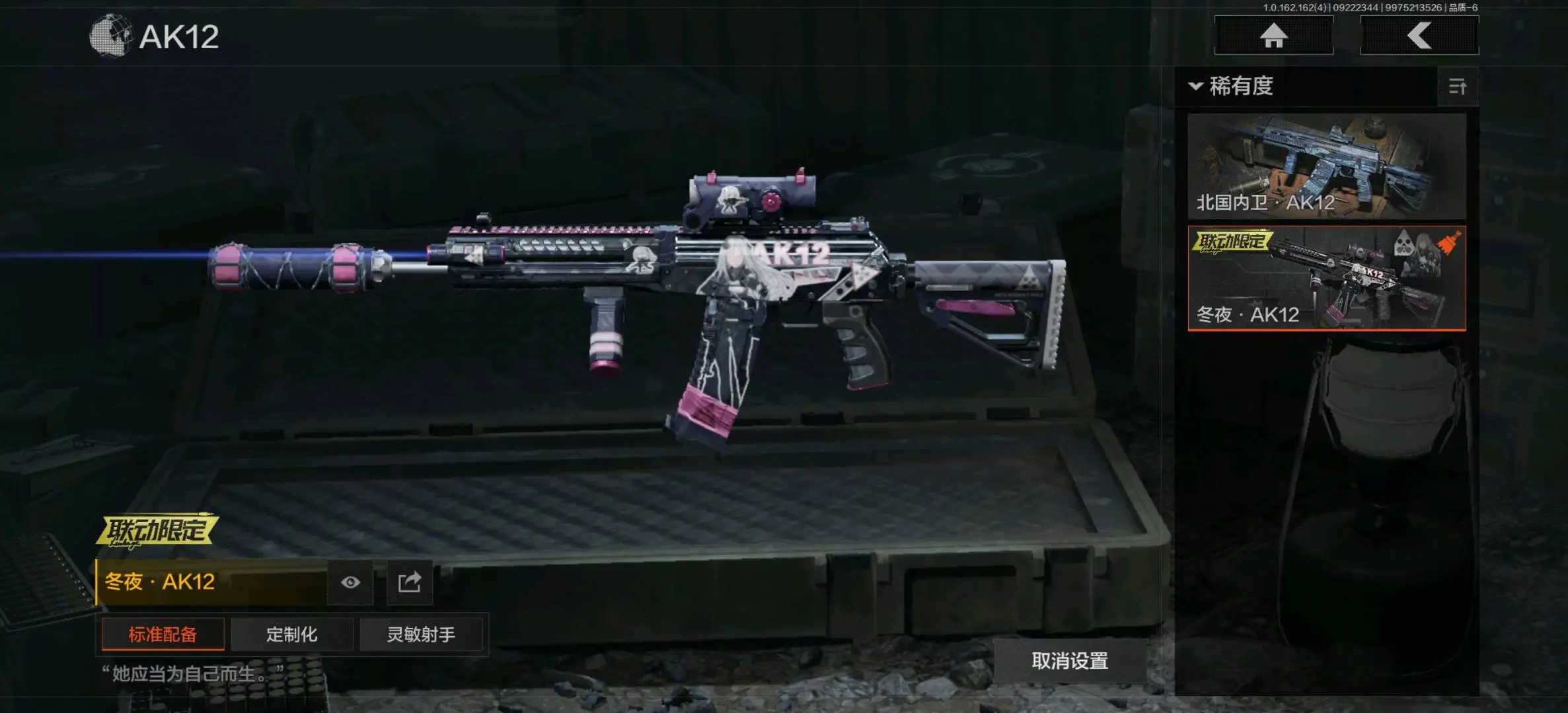 :骑士之剑VSS,冰河碎影MK14,缟兵玄墨VSS,玄戈梨花VSS,骑士之剑MK14,伦琴计量M110,缟兵玄墨M110,玄戈梨花M110,全地形数码M110;