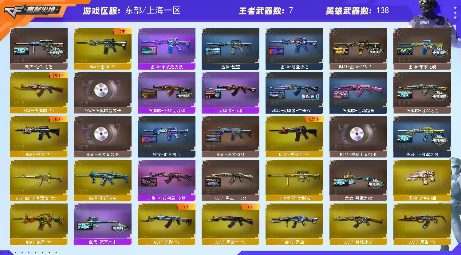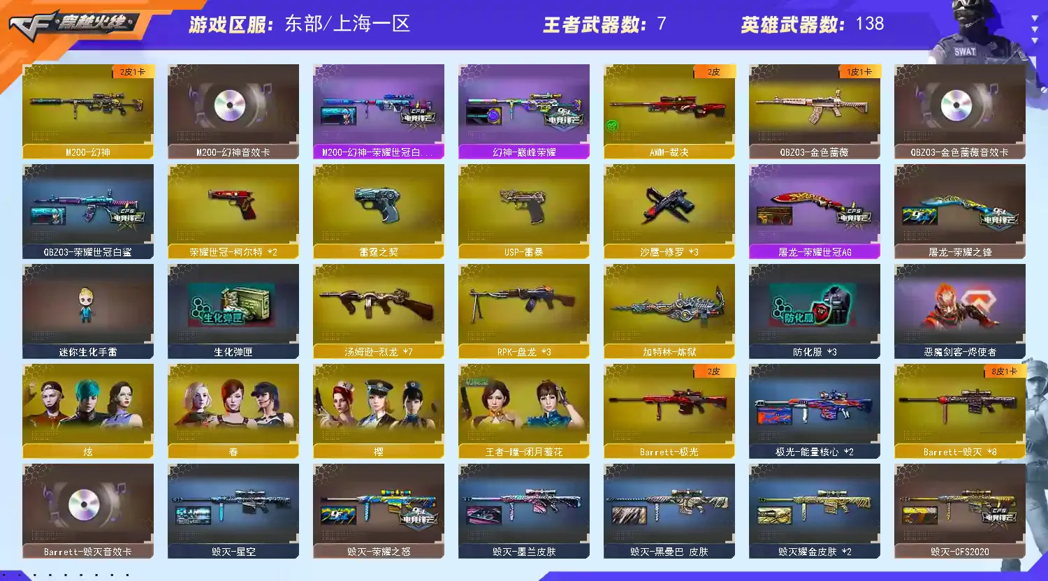 【幻神三件套!!!】 【金色蔷薇三件套!!!】【m200幻神+幻神音效卡+荣耀世冠白鲨皮肤+巅峰荣耀皮肤+usp雷暴】 【7烈龙+3盘龙+炼狱】 【qbz03金色蔷薇+金色蔷薇音效卡+荣耀世冠白鲨皮肤】【白虎电玩蓝兔】【雷暴套装】 【王者之心 王者之翼 王者蔷薇 王者之力 王者之怒】 【火麒麟+火麒麟音效卡+冠军之心皮肤+传奇even皮肤+荣耀世冠ag皮肤】 【黑龙+黑龙音效卡】 【黑骑士+黑骑士音效卡+冠军之势皮肤】【毁灭+毁灭音效卡+荣耀之怒皮肤+冠军之怒皮肤+cfpls15冠军皮肤】 【无影 死神 黑武士 天启 超新星 武圣 机械迷城 黑鲨 朱雀 无影神兵利器 黑武士锦绣游龙 源雷神iv 猎神 烈火动感闪耀 猩红传说 战士 天龙 极光】——【usp雷暴 cop357雷霆 沙鹰修罗 沙鹰天神 天神动感闪耀 荣耀世冠柯尔特】——【屠龙 龙啸 擎天 麒麟刺 尼泊尔雷霆 斩神刀雷暴 麒麟刺堕天神 屠龙动感闪耀 王者之锋】——【雷霆投掷武器套装*6 雷暴投掷武器套装*7】——【热门武器/小人呛】【炫金火麒麟 炫金天龙 死亡之眼 awm灵狐15周年嘉年华】——【角色】【春 樱 炫】