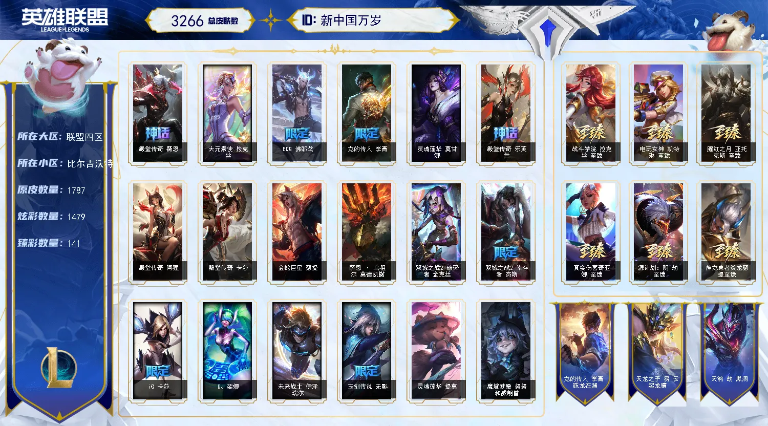 超级号1785原皮-晴天-四圣堂-清空商城-联盟四大区-比尔吉沃特-翡翠-云顶20神话-8色龙虾!