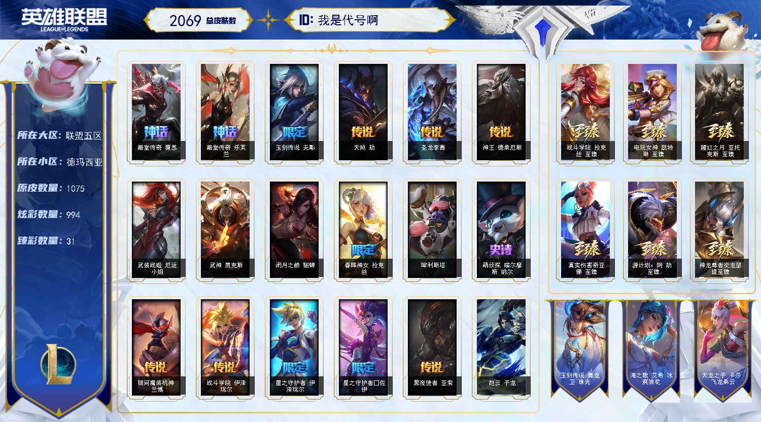2000皮肤〓109至臻海克斯〓摄魂恐惧〓殿堂薇恩乐芙兰〓玉剑男刀〓黑夜黎明神王套〓沄顶神话拉克丝