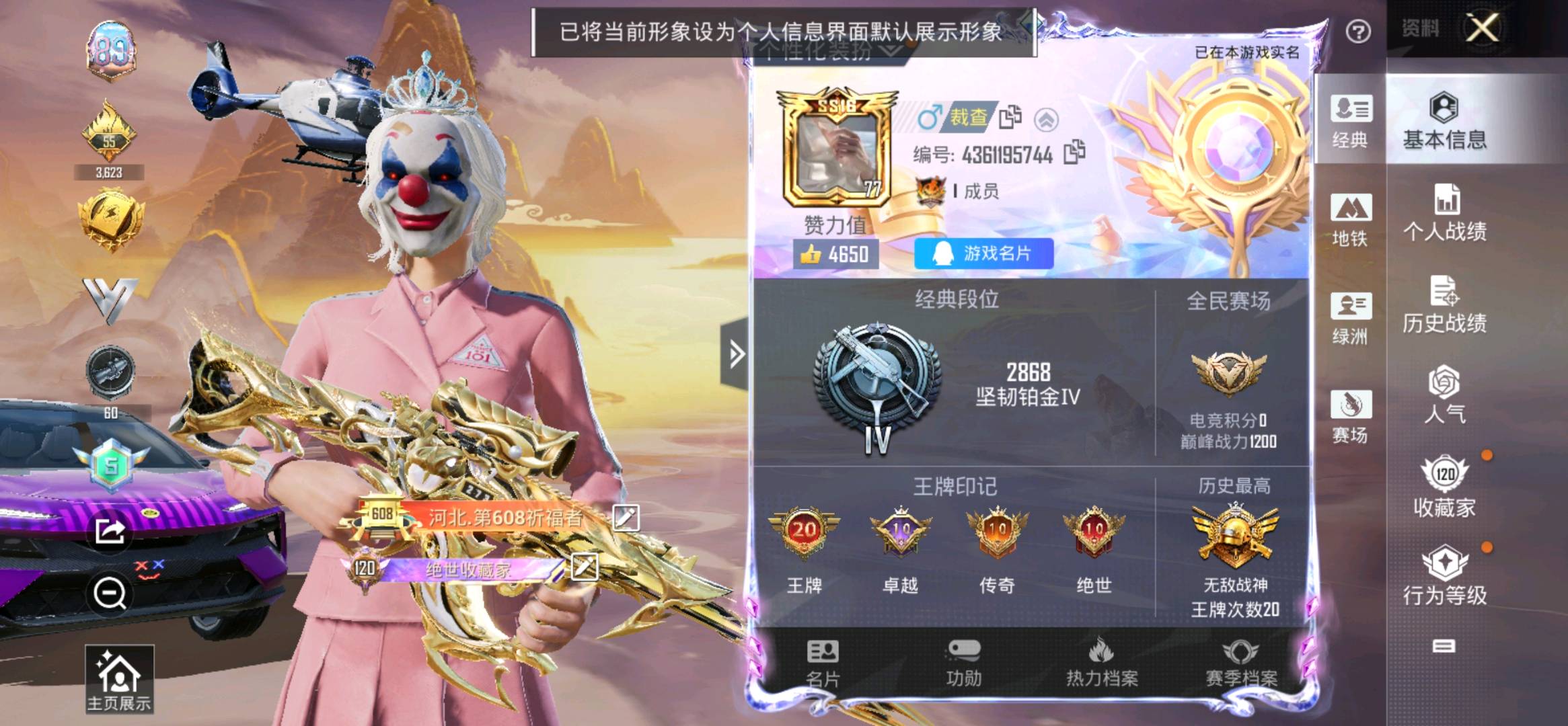 神历史最高段,301993热力值 AKM-盖世英雄/AKM-甜心宝贝/SCAR-L-梦幻火箭/AUG-星梦奇缘/AKM-绿萝繁花/M416-电玩时刻/AUG-星之彼岸/M416-全功率超战/M416-暖熊萌萌/AKM-幽焰骑士/AUG-南国舞曲/SCAR-L-天蓬元帅/M416-心之恋语/AKM-魔法神域/AKM-炫紫旋律/GROZA-精灵之光/M416-墨龙九天/GROZA-焦糖拿铁/SCAR-L-锦绣绵绵/SCAR-L-金蛇镇世/M762-甜蜜誓约/M416-超新星/AKM-梦之光华/蜜獾-异瞳寒姬/Mk14-盛世惊鸿/Mk14-闲梦青缨/VSS-烈焰拳霸/MG3-辉羽雀灵/MG3-梦幻舞会/P90-甜蜜草莓/Vector-环太平洋/Vector-最终圣卫者/UMP45-相思残雪/P90-沙丘之主/破片手榴弹-热量炸弹/Kar98K-巳巳如意/Kar98K-未来歌姬/SVD-月影灵韵/Kar98K-绿意幻情/特斯拉Model 3(珍珠白)/玛莎拉蒂Ghibli(蓝)/宝马M4(灿阳金)/特斯拉Roadster(水滴蓝)/玛莎拉蒂Quattroporte(幻星粉)/宾利欧陆GT敞篷(火焰橘)/萌喵橘座/特斯拉Model X(珍珠白)/路特斯ELETRE(电光紫)/鬼马风驰/合金龙骨(绿)/兰博基尼Aventador(翡翠绿)/路特斯EVIJA(电光紫)/迈凯伦塞纳(电擎蓝)/护世瑞兽/星梦玉骢/关羽赤兔马/赵云玉狮子马/照夜玉狮子/辉羽雀灵自行车/极速兔兔/