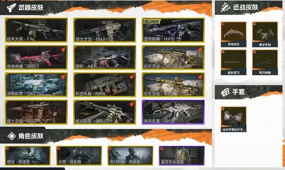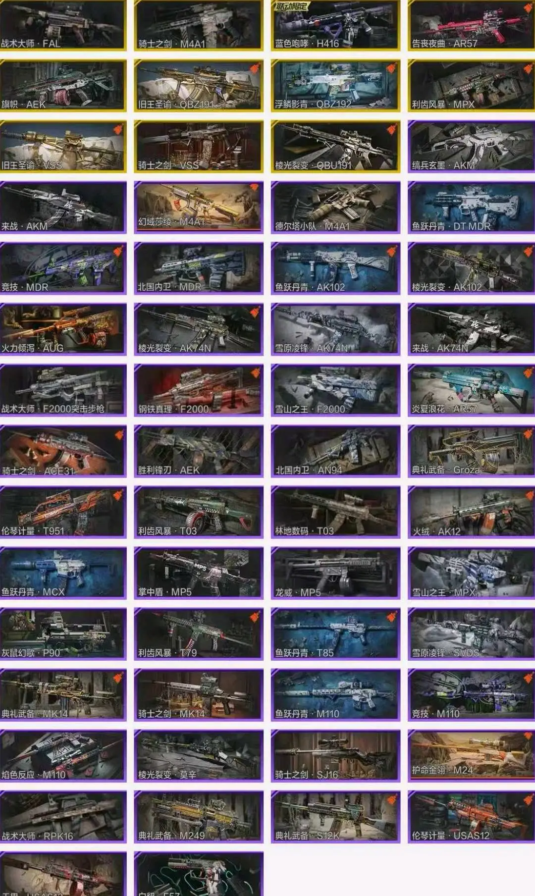 战术大师FAL,骑士之剑M4A1,蓝色咆哮H416,告丧夜曲AR57,旗帜AEK,旧王圣谕QBZ191,浮鳞影青QBZ192,缟兵玄墨AKM,来战AKM,幻域莎绫M4A1,德尔塔小队M4A1,鱼跃丹青DTMDR,竞技MDR,北国内卫MDR,鱼跃丹青AK102,棱光裂变AK102,火力倾泻AUG,棱光裂变AK74N,雪原凌锋AK74N,来战AK74N,战术大师F2000突击步枪,钢铁真理F2000,雪山之王F2000,炎夏浪花AR57,骑士之剑ACE31,胜利锋刃AEK,北国内卫AN94,典礼武备Groza,伦琴计量T951,利齿风暴T03,林地数码T03,火绒AK12,鱼跃丹青MCX;利齿风暴MPX,掌中盾MP5,龙威MP5,雪山之王MPX,灰鼠幻歌P90,利齿风暴T79,鱼跃丹青T85