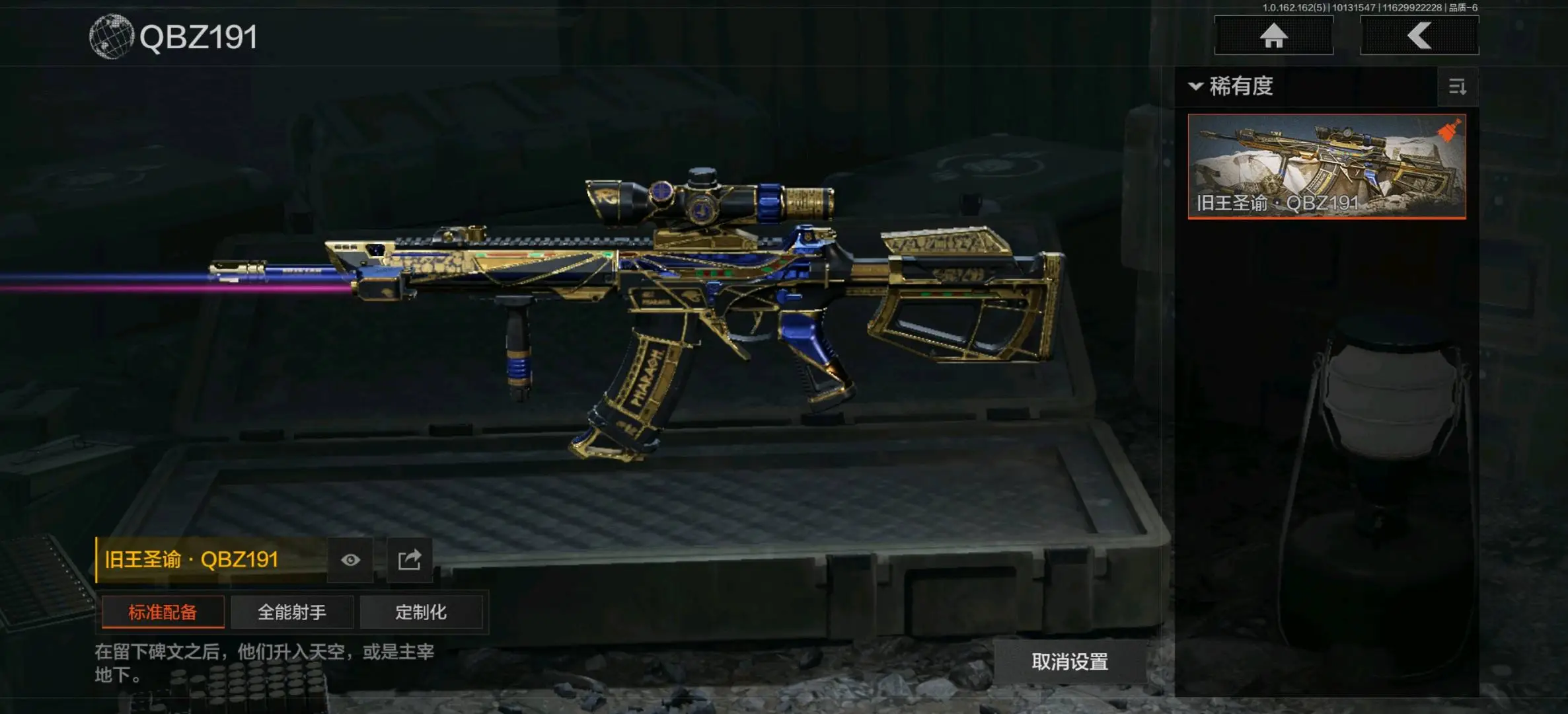 旧王圣谕VSS,骑士之剑VSS,棱光裂变QBU191,雪原凌锋SVDS,典礼武备MK14,骑士之剑MK14,鱼跃丹青M110,竞技M110,焰色反应M110;棱光裂变莫辛,骑士之剑SJ16,护命金翎M24;战术大师RPK16,典礼武备M249;典礼武备S12K,伦琴计量USAS12,无畏USAS12;白貂F57