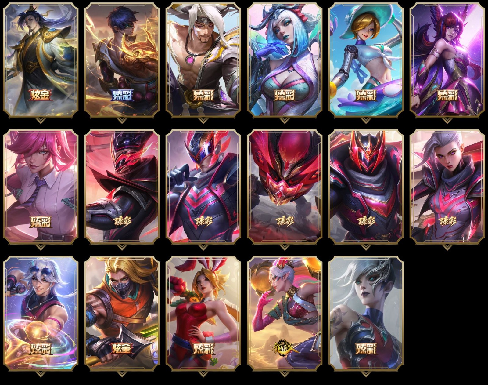 【重要皮肤】暗裔英雄嘉文四世至臻 太空律动魔音海妖娜美至臻 星之守护者辛德拉至臻 星之守护者艾克至臻 魅惑女巫莫甘娜至臻 女帝黛安娜至臻 战斗学院蕾欧娜至臻 太空律动璐璐至臻 魔女婕拉至臻 魔女乐芙兰至臻 奥术师佐伊至臻 未来战士卢锡安至臻 真实伤害亚索至臻 真实伤害赛娜至臻 灵魂莲华提莫至臻 灵能特工伊泽瑞尔至臻 福牛守护者菲奥娜至臻 源计划逆流塞拉斯至臻 源计划阴劫至臻 王国机神玄武盖伦至臻 暗星墨菲特至臻 神龙尊者炎龙瑟提至臻 黑夜使者凯隐至臻 神龙尊者均衡之龙沃利贝尔至臻 征服者贾克斯至臻 飞升战神潘森至臻 焰执事布兰德至臻 KDA二代卡莎至臻 KDA一代卡莎至臻 KDA伊芙琳至臻 KDA伊芙琳2022至臻 战斗学院拉克丝至臻 战斗学院拉克丝2022至臻 烈焰美人薇恩至臻 烈焰美人薇恩2022至臻 电玩女神凯特琳至臻 魅惑女巫厄运小姐至臻 真实伤害奇亚娜至臻 真实伤害奇亚娜2022至臻 绒毛菲兹至臻 绒毛菲兹2022至臻 腥红之月亚托克斯至臻 腥红之月亚托克斯2022至臻 未来战士锤石至臻 未来战士锤石2022至臻 黑夜使者李青至臻 黑夜使者李青2022至臻 灰烬征服者潘森 海克斯科技瑟庄妮 海克斯科技雷克顿 海克斯科技吉格斯 海克斯科技玛尔扎哈 海克斯科技波比 海克斯科技嘉文四世 海克斯科技阿木木 海克斯科技拉莫斯 海克斯科技魔腾 海克斯科技崔丝塔娜 永恒之森奥恩 暗星科加斯 黎明使者卡尔玛 零之枪骑赫卡里姆 摄魂使者薇恩 新创战纪希维尔 灵能特工易 龙的传人李青 神龙烈焰金克丝 碧玉之牙卡西奥佩娅 你看见过我的熊猫吗安妮 美猴王孙悟空 玉净夜叉凯特琳 烈焰美人薇恩 神龙之翼库奇 征服者贾克斯 王国机神青龙德莱文 王国机神朱雀蕾欧娜 王国机神苍狼瑟提 王国机神白虎贾克斯 王国机神玄武盖伦 福牛守护者厄斐琉斯 福牛守护者阿利斯塔 福牛守护者嘉文四世 福牛守护者菲奥娜 胜利之树茂凯 胜利机器人布里茨 胜利女神奥莉安娜 胜利枪神格雷福斯 胜利枪神卢锡安 胜利之剑亚托克斯 觅心萝莉金克丝 觅心猎手薇恩 幽梦玫瑰辛德拉 幽梦玫瑰泰隆 水晶玫瑰婕拉 水晶玫瑰斯维因 冬季仙境奥莉安娜 圣诞老人德莱文 冰雪驯鹿波比 冰雪风暴希维尔 狂心冰王图奇 魄罗骑士瑟庄妮 夺命美人卡特琳娜 平安夜女神娑娜 圣诞糖果棒厄运小姐 魅惑女巫莫甘娜 伯爵卡萨丁 泳池派对辛德拉 泳池派对奥莉安娜 泳池派对嘉文四世 泳池派对塔莉垭 泳池派对塔里克 泳池派对蕾欧娜 送披萨的小姐姐希维尔 制胜金球拉莫斯 FPX锤石 FPX薇恩 FPX李青 FPX普朗克 FPX墨菲特 iG卡蜜尔 iG洛 iG卡莎 iG艾瑞莉娅 iG乐芙兰 iG菲奥娜 SSG洛 SKTT1扎克 SKTT1奥拉夫 SKTT1瑞兹 SKTT1阿兹尔 SKTT1雷克顿 SSW雷恩加尔 SSW泰隆 SSW图奇 SSW辛吉德 SKTT1李青 暗杀星奥莉安娜 暗杀星慎 Fnatic库奇 Fnatic嘉文四世 Fnatic卡尔萨斯 冰雪节辛吉德 防暴天使凯尔 鬼影森森茂凯 鬼影重重魔腾 海贼瑞兹 胡桃夹子萨科 惊悚派对阿木木 南瓜头费德提克 圣诞狂欢努努和威朗普 圣诞老人古拉加斯 雪默丁格 雪装奈德丽 野兽猎人德莱文 野兽猎人瑟庄妮 野兽猎人泰达米尔 勇者阿狸 征服者阿利斯塔 征服者韦鲁斯 暗影沃里克 2021全球总决赛嘉文四世 波比的巧克力工坊 都铎王朝图奇 十五周年纪念希维尔 十周年纪念安妮 源代码乐芙兰 神凰行者瑞羽圣凰艾尼维亚 暗裔英雄盖伦 DJ娑娜 灵魂守卫乌迪尔 KDAALLOUT萨勒芬妮独立音乐人 KDAALLOUT萨勒芬妮明日新星 KDAALLOUT萨勒芬妮超级巨星