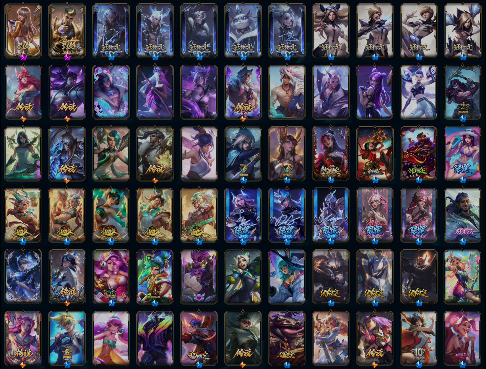 【传说皮肤】血石领主弗拉基米尔 恶魔之刃泰达米尔 战地巨兽科加斯 钢铁之翼凯尔 幻灵战斗队长厄运小姐 大天使长米迦勒凯尔 月蚀骑士蕾欧娜 西部天使赛娜 神龙尊者夜月幻龙亚索 神龙尊者昼日真龙亚索 黎明使者永恩 丧尸布兰德 女主播迦娜 天煞劫 驯龙学者黑默丁格 西部魔影卢锡安 律政大亨蒙多 符文战熊沃利贝尔 陆地王者4WD布里茨 偶像歌手阿狸 绅士科加斯 冰霜亚龙希瓦娜 合金巨兽努努和威朗普 神王盖伦 神龙尊者圣龙李青 灵能特工娑娜 灵魂莲华锤石 约德尔国队长提莫 金牌主播德莱文 枯萎之壤泽拉斯 提莫约德尔人的一大步 奥德赛凯隐 第三类接触黑默丁格 星之守护者拉克丝 腥红之月鬼武姬阿卡丽 恶魔男爵瑞兹 黯晶凤凰艾尼维亚 黑夜使者亚索 女皇艾希 冰霜之刃艾瑞莉娅 女警狙击凯特琳 黯黑魔龙希瓦娜 源计划林易 暗星尊烬 冰川巨兽墨菲特 战地机甲厄加特 最终BOSS维迦 宇航员诺提勒斯 红色男爵库奇 地狱之门卫士加里奥 暗星锤石 战场女武神凯尔 双重冰晶艾尼维亚 屠龙勇士潘森 源计划净化薇恩 西部天使艾希 灌篮高手德莱厄斯 星之守护者霞 星之守护者洛 银河魔装机神兰博 未来战士凯特琳 源计划联合艾希 上古战魂魔腾 神王德莱厄斯 苍穹之光韦鲁斯