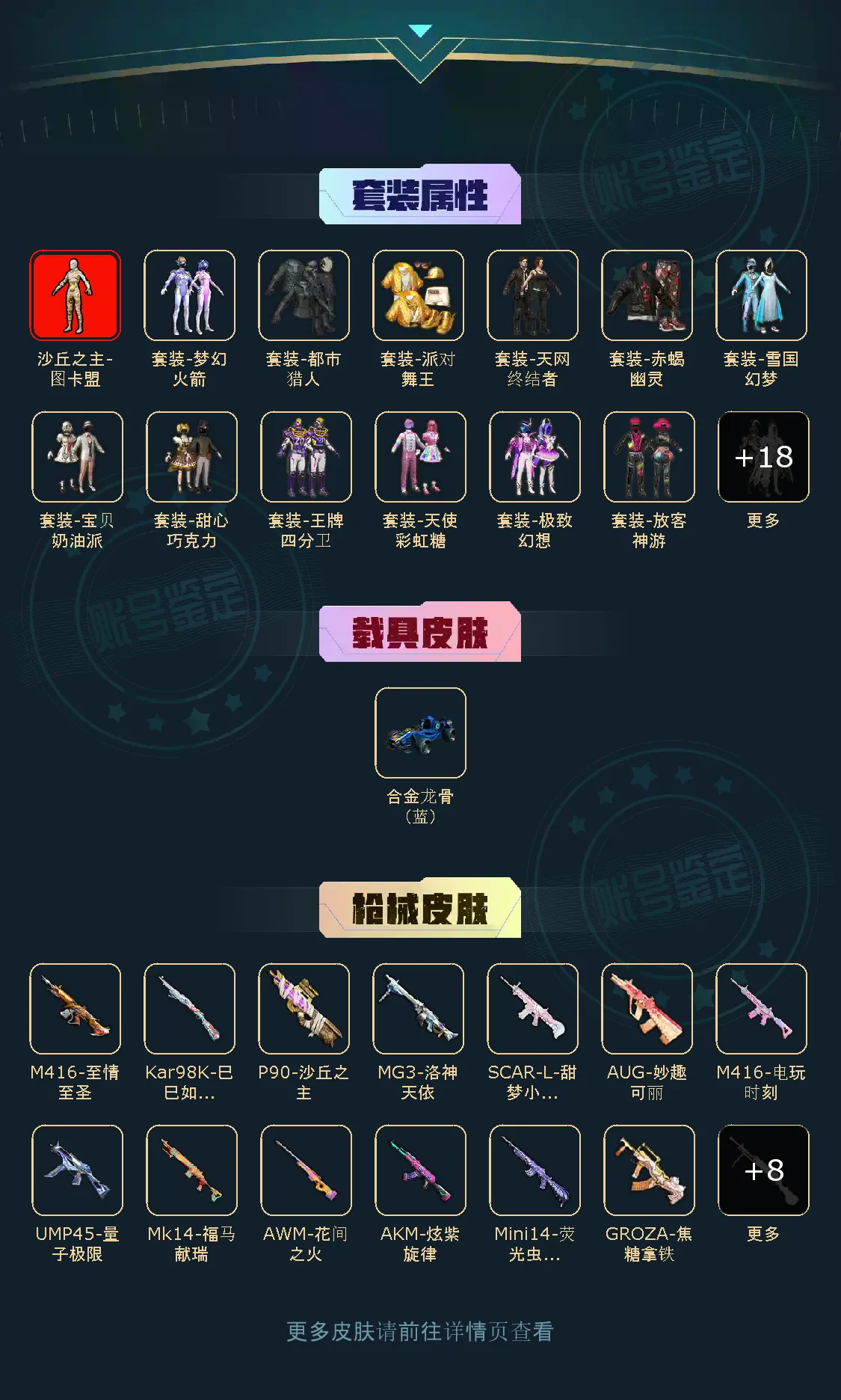 【稀有资产】沙丘之主-图卡盟[3级]/套装-雪国幻梦/套装-派对舞王/套装-深海小丑鱼/套装-赤蝎幽灵/套装-都市猎人/套装-天网终结者/套装-奇异狩猎者/套装-浪漫天命/套装-暗影哥特/套装-龟仙人/角色-都市丽猫/角色-摩登魅猫/套装-狂沙舞者/套装-东方飞龙/套装-冷酷挑战者/M416-星际漫游/M416-黄金龙骨/M416-快乐主宰