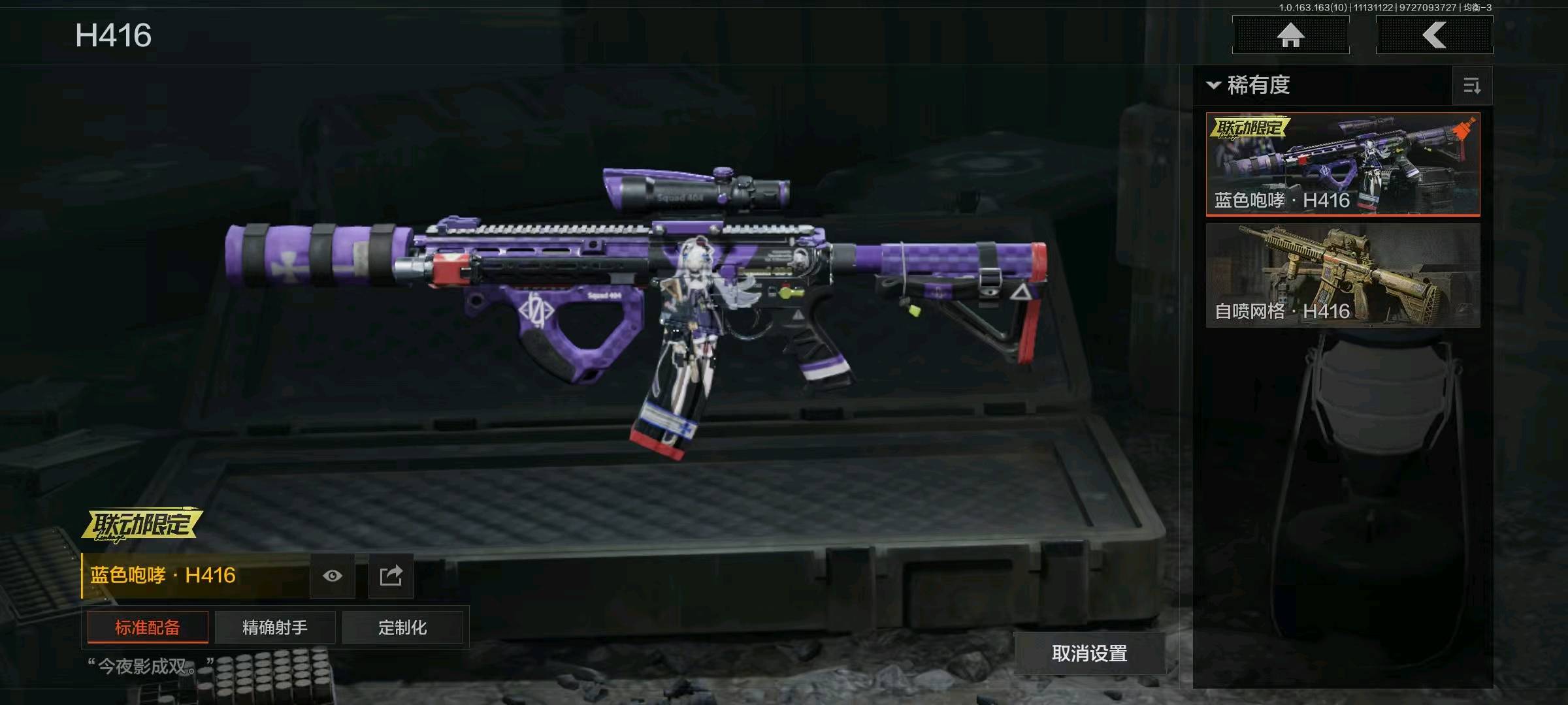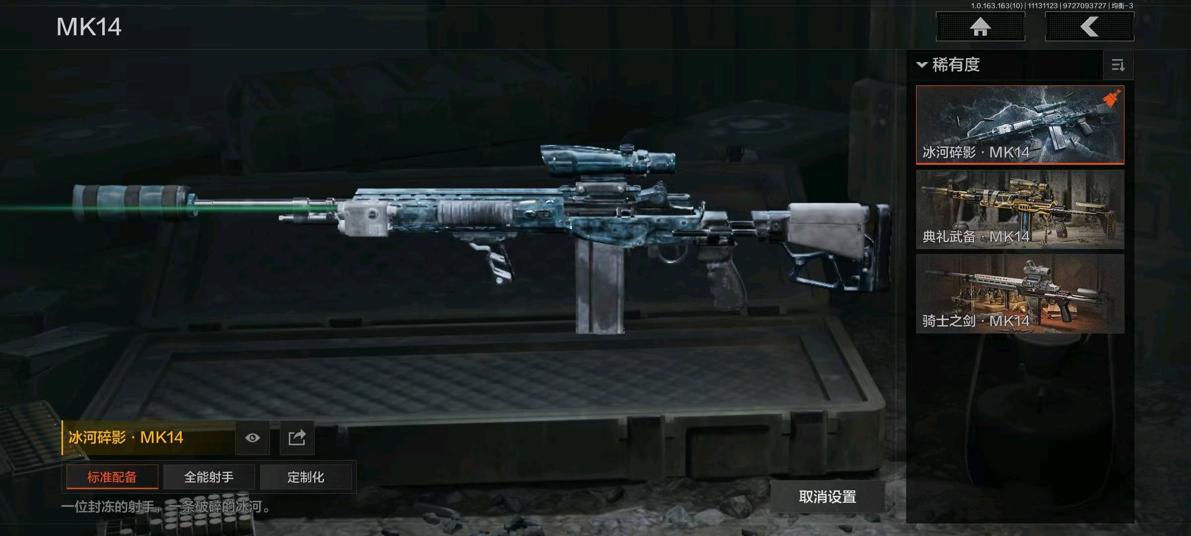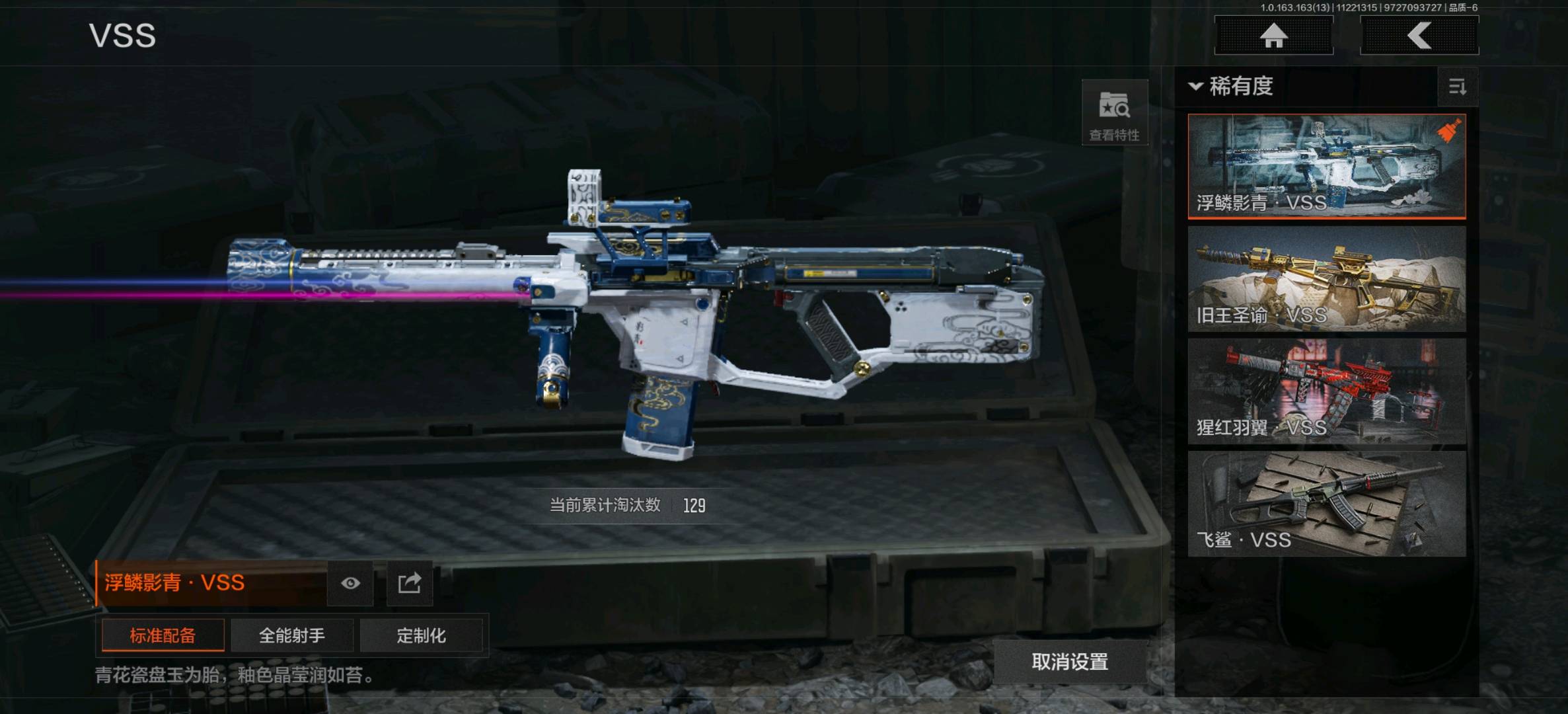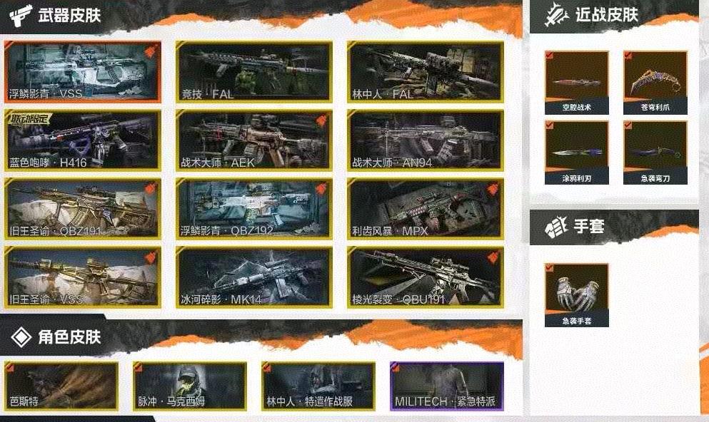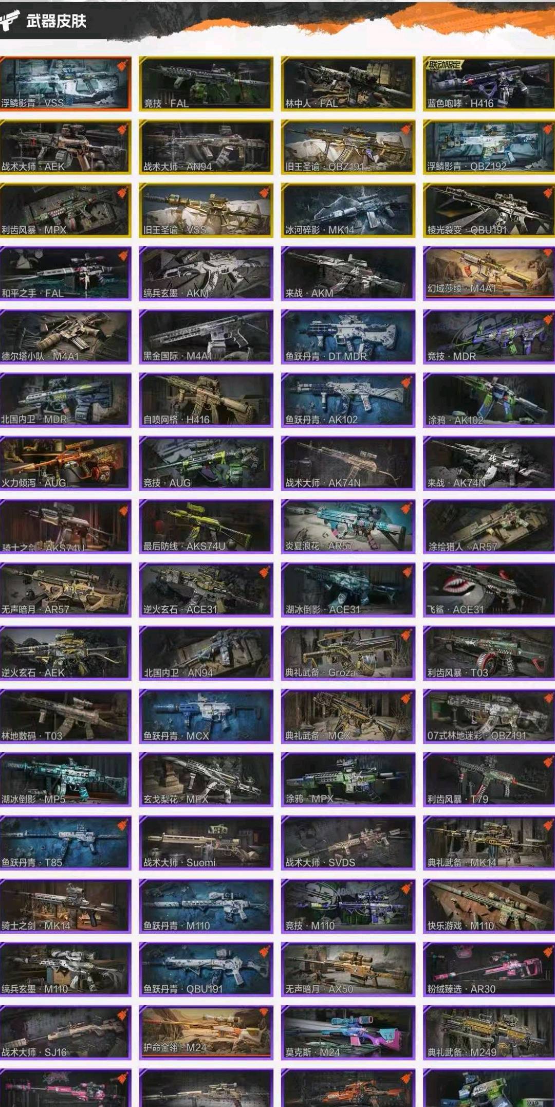 浮鳞影青VSS,旧王圣谕VSS,冰河碎影MK14,棱光裂变QBU191,战术大师SVDS,典礼武备MK14,骑士之剑MK14,鱼跃丹青M110,竞技M110,快乐游戏M110,缟兵玄墨M110,鱼跃丹青QBU191;:无声暗月AX50,粉绒臻选AR30,战术大师SJ16,护命金翎M24,莫克斯M24;:典礼武备M249;:粉绒臻选SKS,战术大师SKS,伦琴计量SKS;涂鸦G18C;
