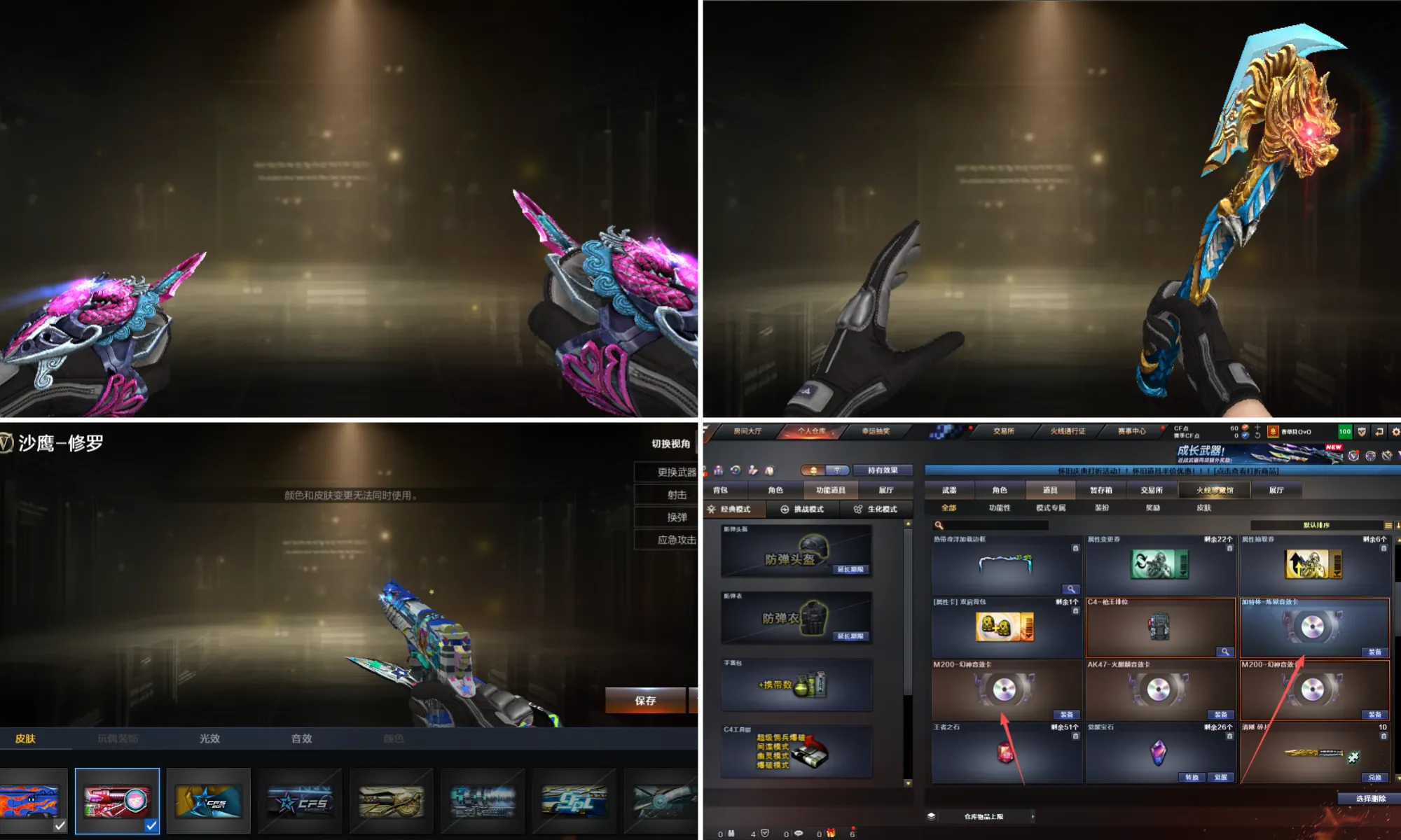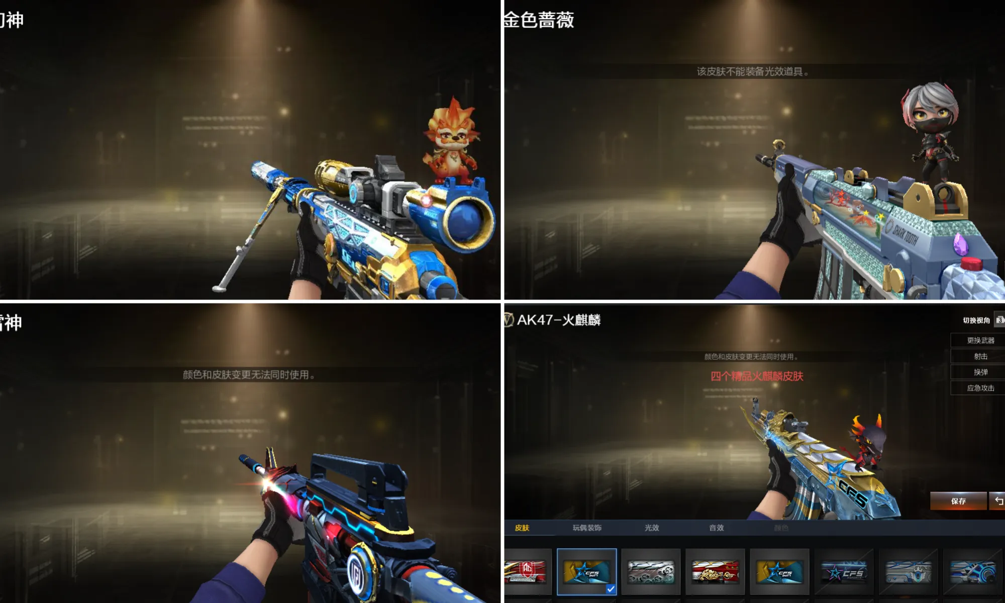 【重要武器皮肤】幻神-冠军之幻/毁灭-星空/极光-能量核心/天龙-能量核心/火麒麟-CFSTAR/火麒麟-AG/火麒麟-华夏之心/火麒麟-轻羽皮肤/雷神-R.LGD-CFPLS18冠军/雷神-耀金皮肤/金色蔷薇-热带奇洋 皮肤/修罗-CFSTAR/修罗-能量核心/修罗-15周年嘉年华 皮肤/麒麟刺-荣耀世冠白鲨/龙啸-冠军之啸