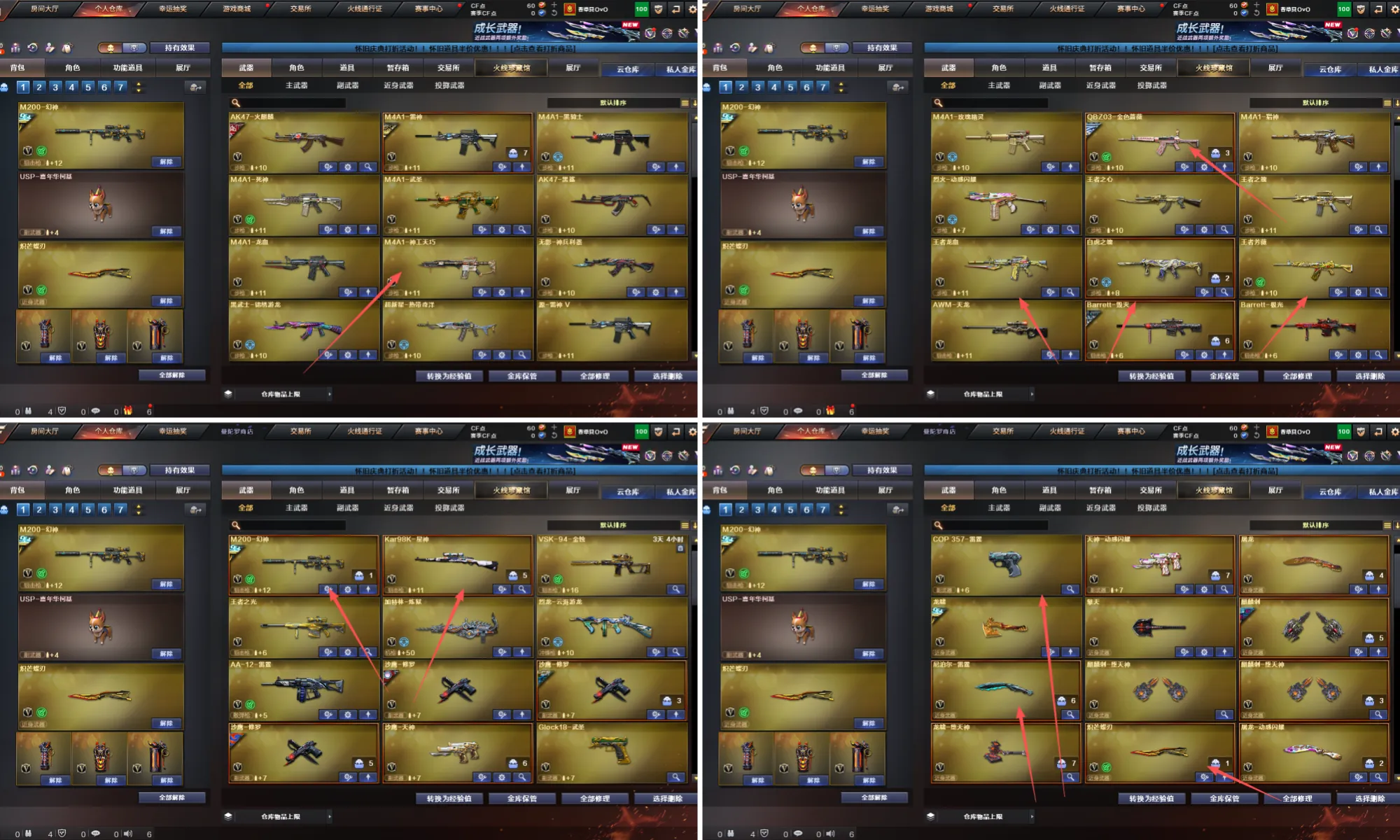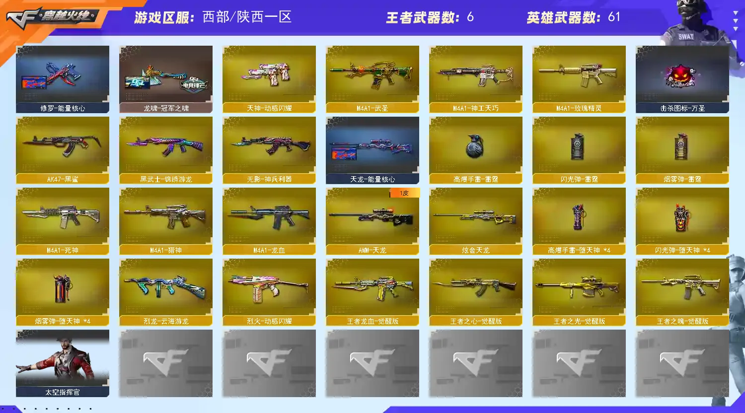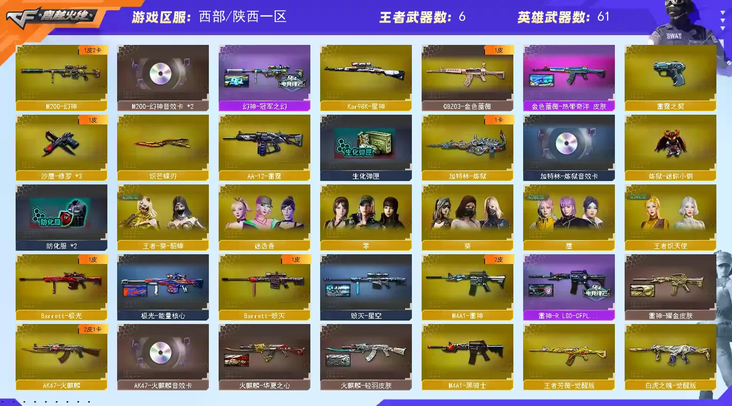 【其他重要武器】炫金天龙/炫金修罗/激光毁灭者III/9A-91-圣诞/AK47-盛典-CFS 2022/M4A1-电音/AK47-大帝林肯/AK47-雷蛇/QBZ03-锋芒破茧(2)/M14EBR-炎龙(2)/百城AK47/M4A1-S-十周年/黄金AK-47(2)/M4A1-万圣节2020/M4A1-Guitar 炫彩/AK-47-红龙/M4A1-S-火种(2)/AK47-B-十周年/QBZ03-吕布(2)/XM8-炫彩/M4CQBR-AP-孔明/M4A1-S-能量核心/M4A1-秘银赤龙(2)/AK47-轮回(2)/AK47-枪娘/M4A1-SS-枪王排位(2)/M4A1-紫狱/AK47-圣诞节[2019]/9A91-赤血龙魂(5)/AK47-破空冰刃(2)/M4A1-破空冰刃/AK47-万圣节2018(2)/AK47-SS-枪王排位/M4A1C-死亡之翼/AK47-齐天大圣/AK47-十年火线/M4A1-情人节2019/QBZ03-烛龙/9A91-蓝色骑士/AK-12-CFS2017纪念版/AK47-肯德基/9A91-2017万圣节/AK47-苍龙/神罚/AWM-盛典-CFS 2022/AWM-Pink/雷蛇AWM(2)/M200-庆典-CFS 2021/AWM-小故障(3)/百城AWM(2)/Barrett-麟龙/黄金AWM/M82A1-封神/AWM-十周年/AWM-7周年/Barrett-苍龙/M200-大黄蜂(3)/AWM-蓝水晶(2)/破天狂龙(2)/M200-落樱/Barrett-捣乱兔兔/M200-青花瓷/M200-神秘黑洞/AWM-恶棍-枪王排位(2)/巴雷特-情人节2020/M200-情人节2019(2)/M200-万圣节2018/M200-涂鸦/AWM-涂鸦/98K-蓝色骑士/破天九龙/凤凰之力/AWM-A/AWM-圣诞/AWM-圣诞2013/M200-万圣节/末日裁决者(2)/KAC-耀龙/EVOIII-萌杀/MK5-枪王排位/EVOⅢ-黑金传说/斯泰尔-CFS2017纪念版/EVO III-赤血龙魂/斯泰尔-巧克力/死亡之眼/神圣爆裂者-末日III/Spas-12-黑金/Spas-12-幻能朋克/SPAS-12-雷电核心/愤怒公牛左轮-枪王排位(3)/沙漠之鹰-盛典-CFS 2022/COP 357-子鼠/Anaconda-雷电核心(2)/COP 357-万圣节2020/COP-机甲刑天/Anaconda-炽焰核心/MAC-10-涂鸦(2)/沙鹰-枪王排位(3)/COP357-神秘黑洞/新USP-枪王排位奖励(3)/COP357-十二生肖·羊/Cop357-萌杀/幻影沙鹰-枪王排位/COP 357--绚樱/沙鹰-万圣节2018(2)/沙鹰-雷蛇/凤凰之灵/凤凰之火(2)/尼泊尔-庆典-CFS 2021/蝴蝶刀-枪王排位/招财猫-枪王排位(2)/Laser Sword-夏日/军用铁锹-赤龙(2)/啸天/军用铁锹-飞龙在天/丛林匕首-枪王排位/收割者-枪王排位/鹰爪-枪王排位/疾爆手雷-河马/惨叫鸡高爆手雷/闪光弹-枪王排位(3)/幽灵宝宝手雷