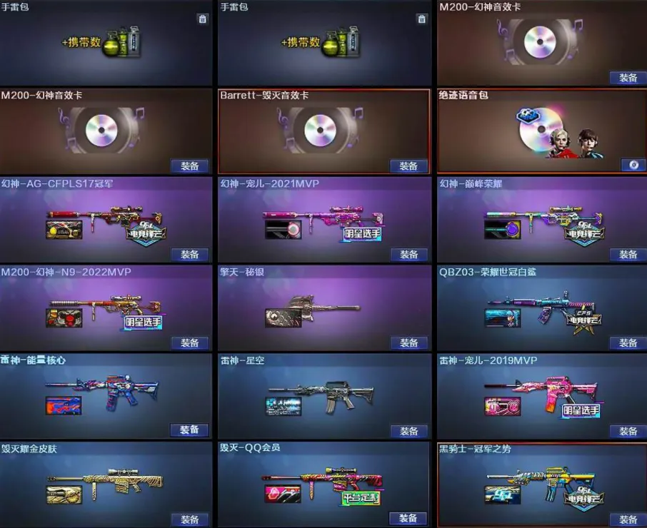【皮肤】:AWM-天龙-传奇白鲨/幻神-AG-CFPLS17冠军/幻神-宠儿-2021MVP/幻神-巅峰荣耀/毁灭耀金皮肤/毁灭-冠军之怒/黑骑士-冠军之势/黑骑士-地狱火/雷神-能量核心/雷神-星空/雷神-宠儿-2019MVP/M200-幻神-N9-2022MVP/QBZ03-荣耀世冠白鲨/火麒麟-雷神/毁灭/天启-暗月/极光-能量核心/修罗-能量核心/屠龙/擎天-秘银