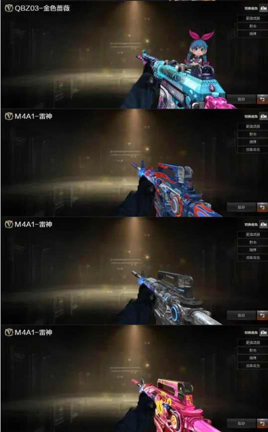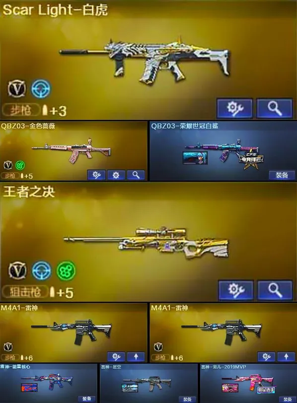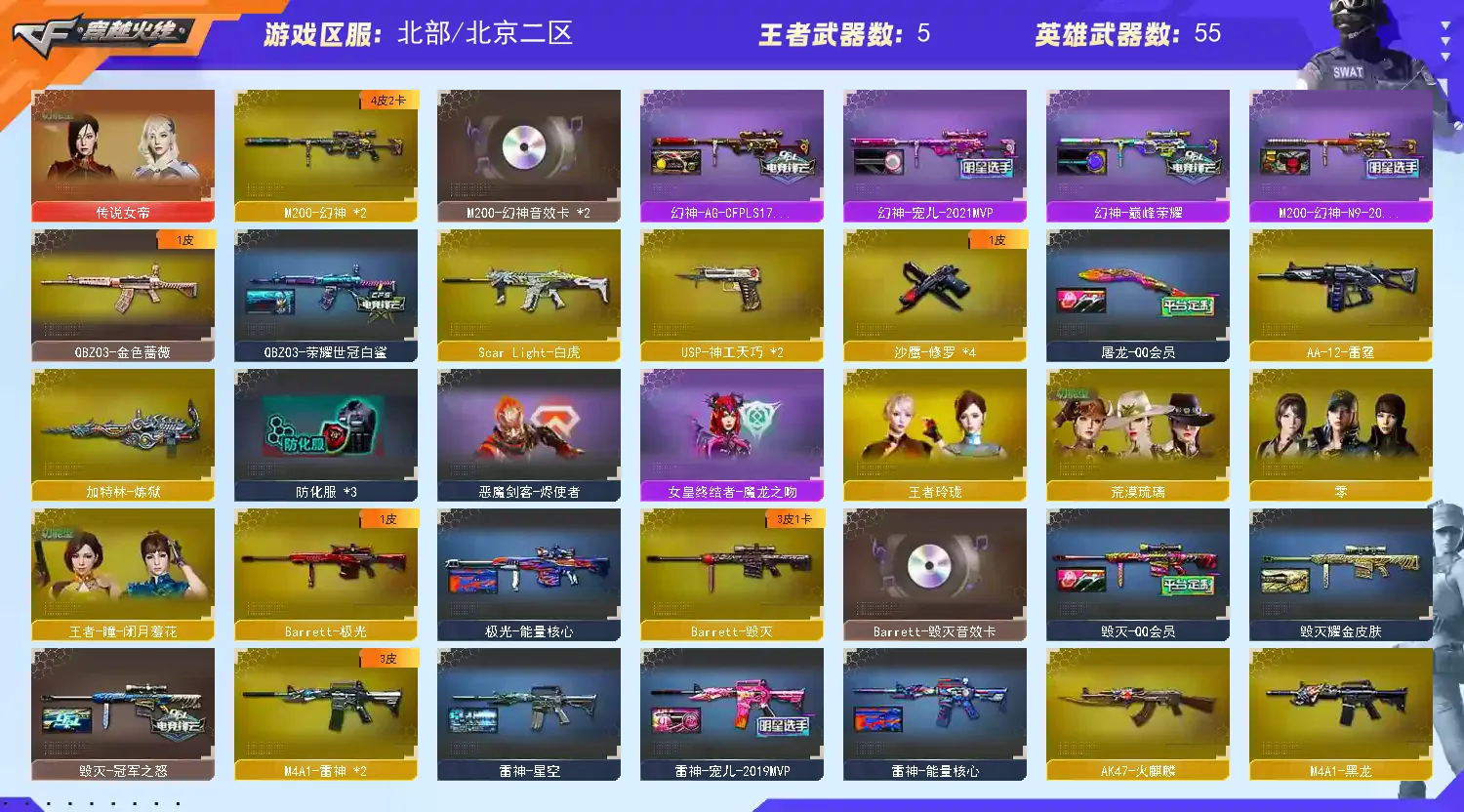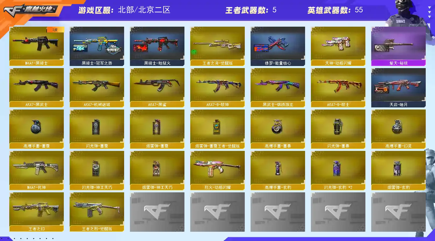 【英雄级武器】:AK47-火麒麟/AK47-黑武士/AK47-机械迷城/AK47-黑鲨/AA-12-雷霆/Barrett-毁灭/Barrett-极光/加特林-炼狱/龙啸/M4A1-黑龙/M4A1-雷神(2)/M4A1-黑骑士/M4A1-死神/M200-幻神(2)/擎天/麒麟刺/沙鹰-修罗(4)/沙鹰-天神/屠龙(3)/USP-神工天巧(2)/ScarLight-白虎/黑武士-锦绣游龙/超新星-热带奇洋/QBZ03-金色蔷薇/烈火-动感闪耀/AK47-B-战神/王者之烈-觉醒版/王者之决-觉醒版/天神-动感闪耀/屠龙-动感闪耀/龙啸-热带奇洋/丛林匕首-玄豹/高爆手雷-雷霆/高爆手雷-雷暴/高爆手雷-幻灵/手雷-动感闪耀/手雷-热带奇洋/高爆手雷-古蛇迷踪/高爆手雷-玄豹/闪光弹-雷霆/闪光弹-雷暴/闪光弹-神工天巧/闪光弹-玄豹(2)/烟雾弹-雷霆/烟雾弹-神工天巧/烟雾弹-古蛇迷踪/烟雾弹-玄豹/烟雾弹-雷霆王者-觉醒版/M4A1-赤狱骑士