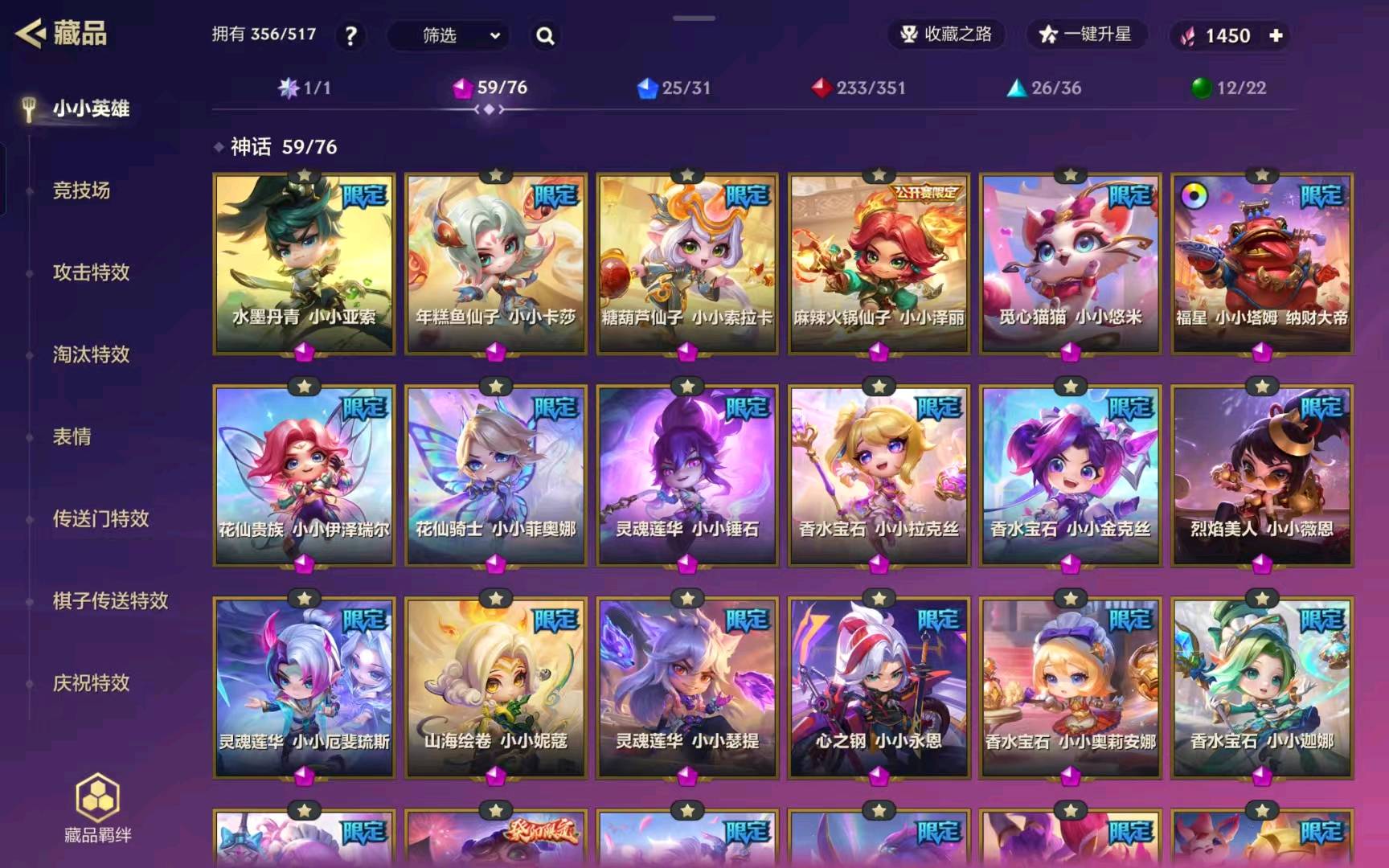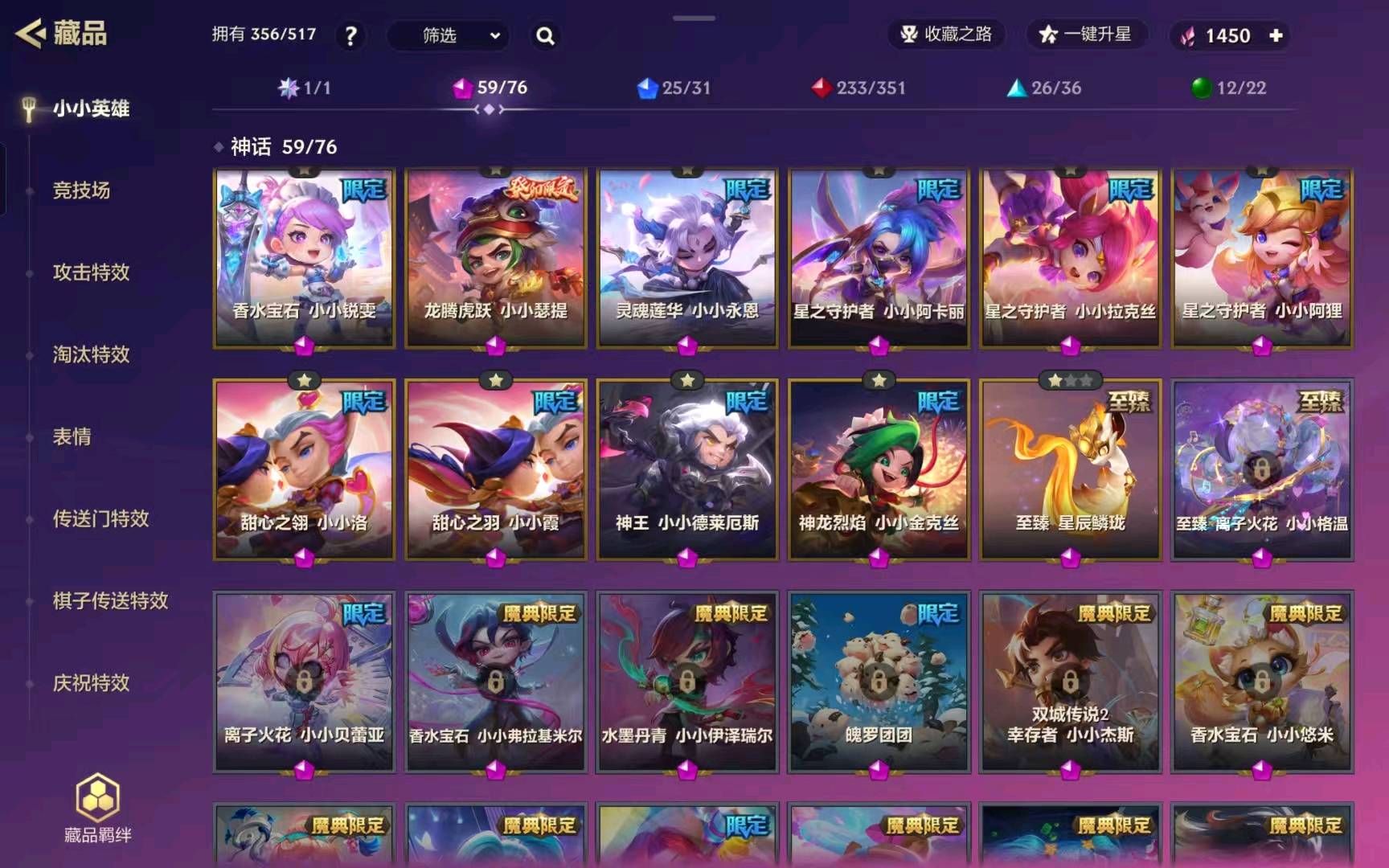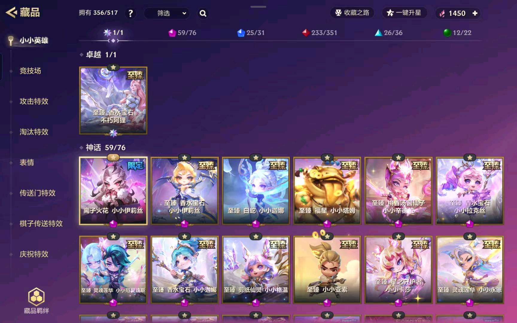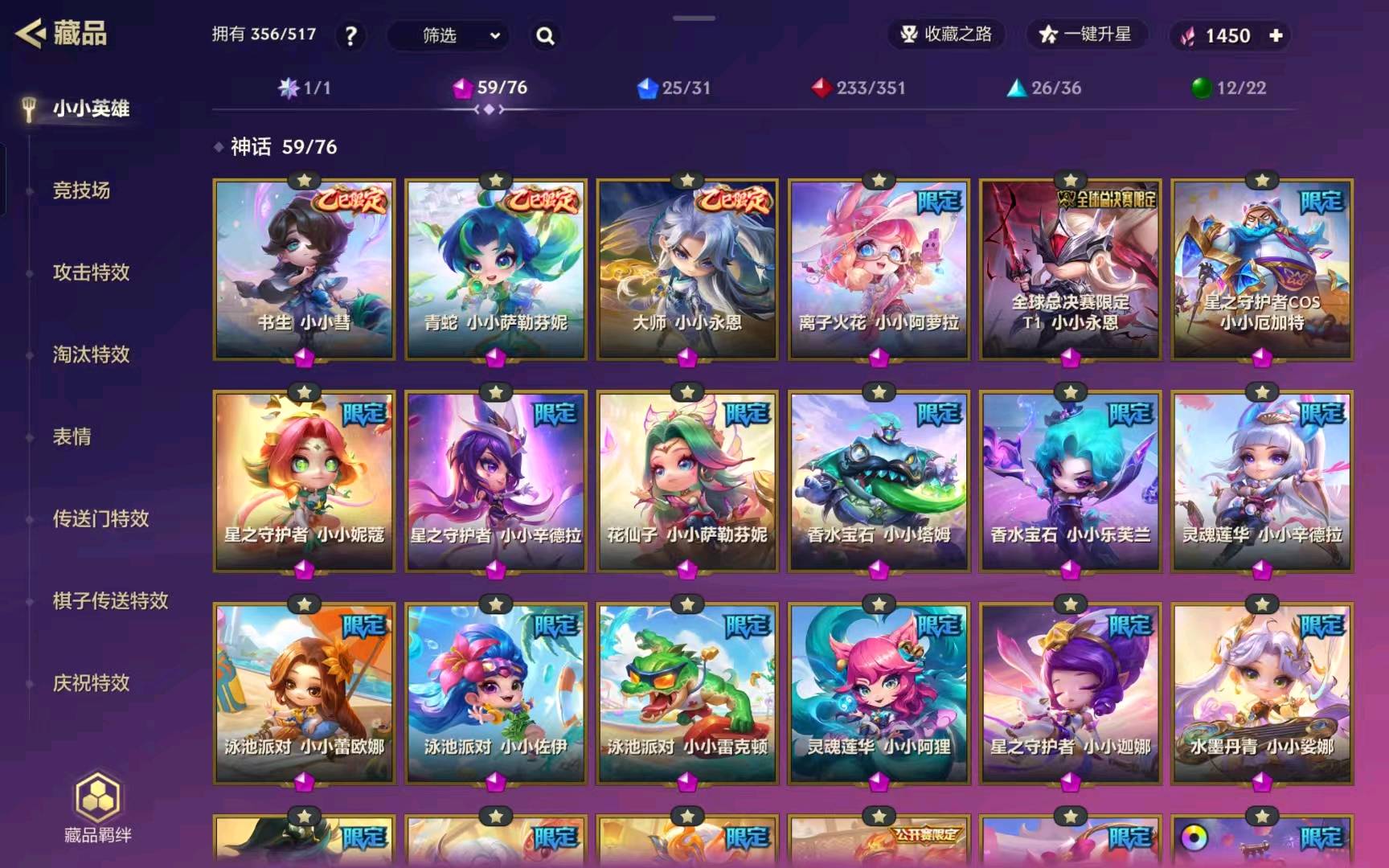 356个小小英雄 有大大阿狸 香水宝石 星之守护 离子火花(蜘蛛 兔子)女性皮肤较多 男性永恩较多一点