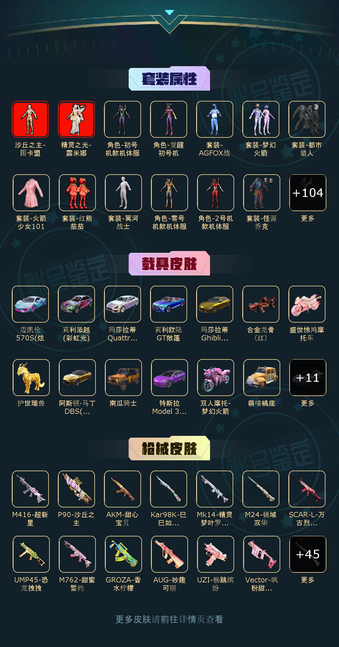 108粉,24载具,58特效枪,599套装,23王牌印记 AKM-甜心宝贝/SCAR-L-童趣迷兔/Kar98K-伏魔团/AUG-星之彼岸/AWM-花间之火/GROZA-香水柠檬/M416-心之恋语/平底锅-林间仙鹿/M16A4-葫芦兄弟/Mini14-荧光虫舞/DP-28-枪炮玫瑰/AKM-炫紫旋律/MG3-洛神天依/GROZA-焦糖拿铁/SLR-暗夜玫瑰/M762-甜蜜誓约/UMP45-相思残雪/UMP45-恐龙拽拽/M249-蓝莓炮弹/玛莎拉蒂Ghibli(金)/萌喵橘座/特斯拉Roadster(尊享铂)/双人摩托-梦幻火箭/特斯拉Cybertruck(极昼黑)/兰博基尼Estoque(炫光金)/快艇-塞莎KL27(霓虹粉)/特斯拉Model 3(奇幻紫)/阿斯顿·马丁DBS(金)/鬼马风驰/南瓜骑士/合金龙骨(红)/兰博基尼SVJ(尊享铂)