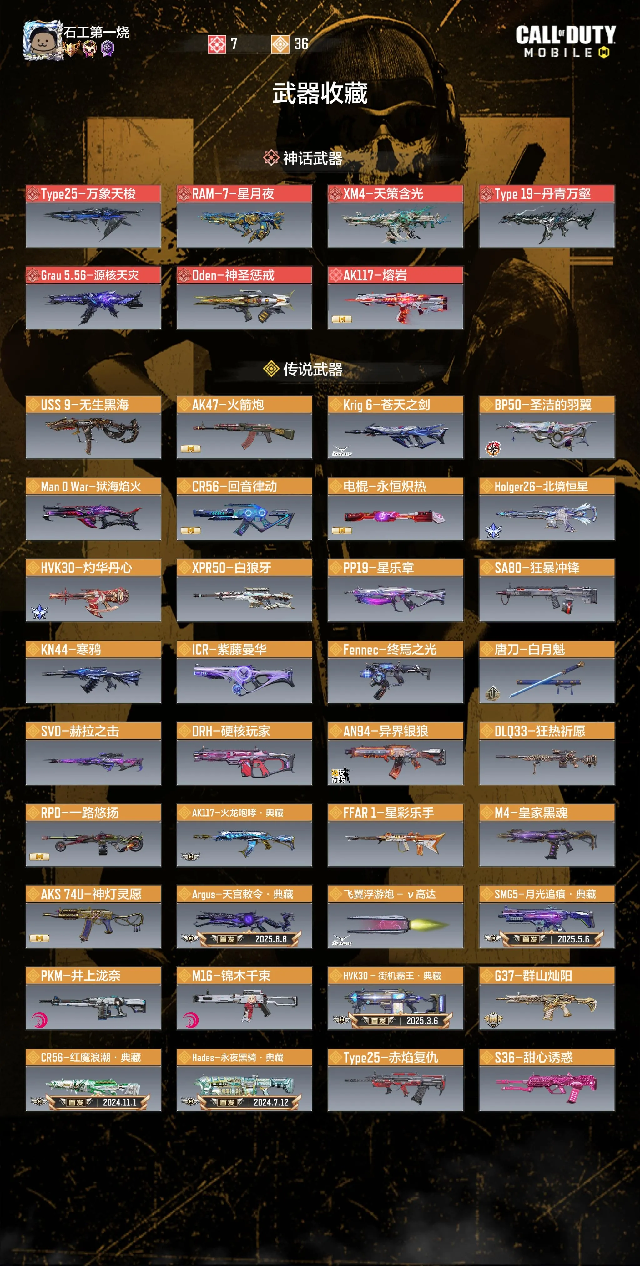 USS9-无生黑海 AK47-火箭炮 Krig6-苍天之剑 BP50-圣洁的羽翼 Man0War-狱海焰火 CR56-回音律动 电棍-永恒炽热 Holger26-北境恒星 HVK30-灼华丹心 XPR50-白狼牙 PP19-星乐章 SA80-狂暴冲锋 KN44-寒鸦 ICR-紫藤曼华 Fennec-终焉之光 唐刀-白月魁 SVD-赫拉之击 DRH-硬核玩家 AN94-异界银狼 DLQ33-狂热祈愿 RPD-一路悠扬 AK117-火龙咆哮·典藏 FFAR1-星彩乐手 M4-皇家黑魂 AKS74U-神灯灵愿 Argus-天宫敕令·典藏 飞翼浮游炮-v高达 SMG5-月光追痕·典藏 PKM-井上泷奈 M16-锦木千束 HVK30-街机霸王·典藏 G37-群山灿阳 CR56-红魔浪潮·典藏 Hades-永夜黑骑·典藏 Type25-赤焰复仇 S36-甜心诱惑