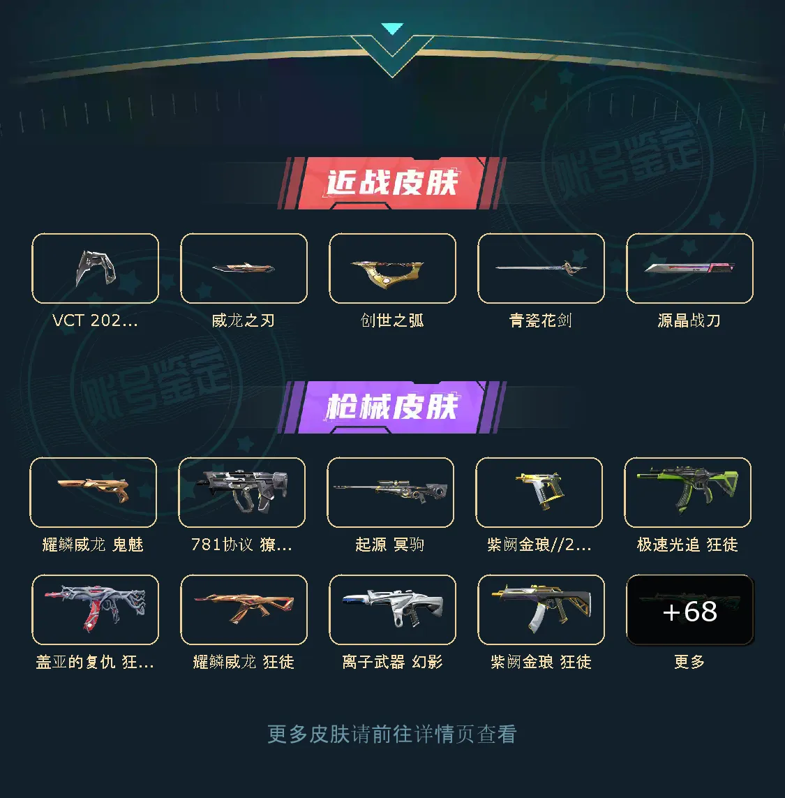 82件皮肤图鉴 全角色 有绝版VCT爪刀 威龙全套 盖亚狂徒 离子幻影 显卡狂徒 青龙狂徒 781撩犬 青花瓷 离子冥驹 起源冥驹 等等武器…