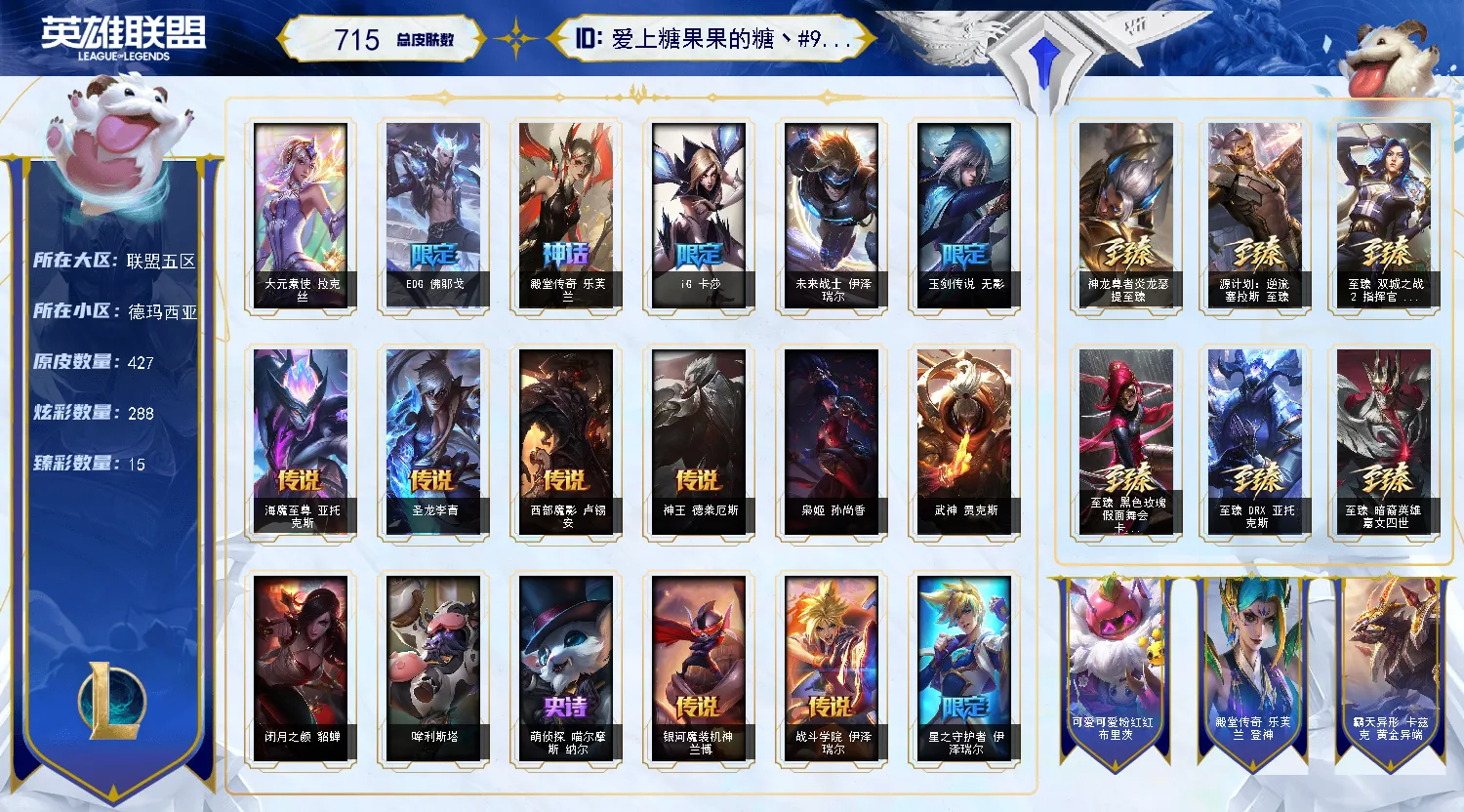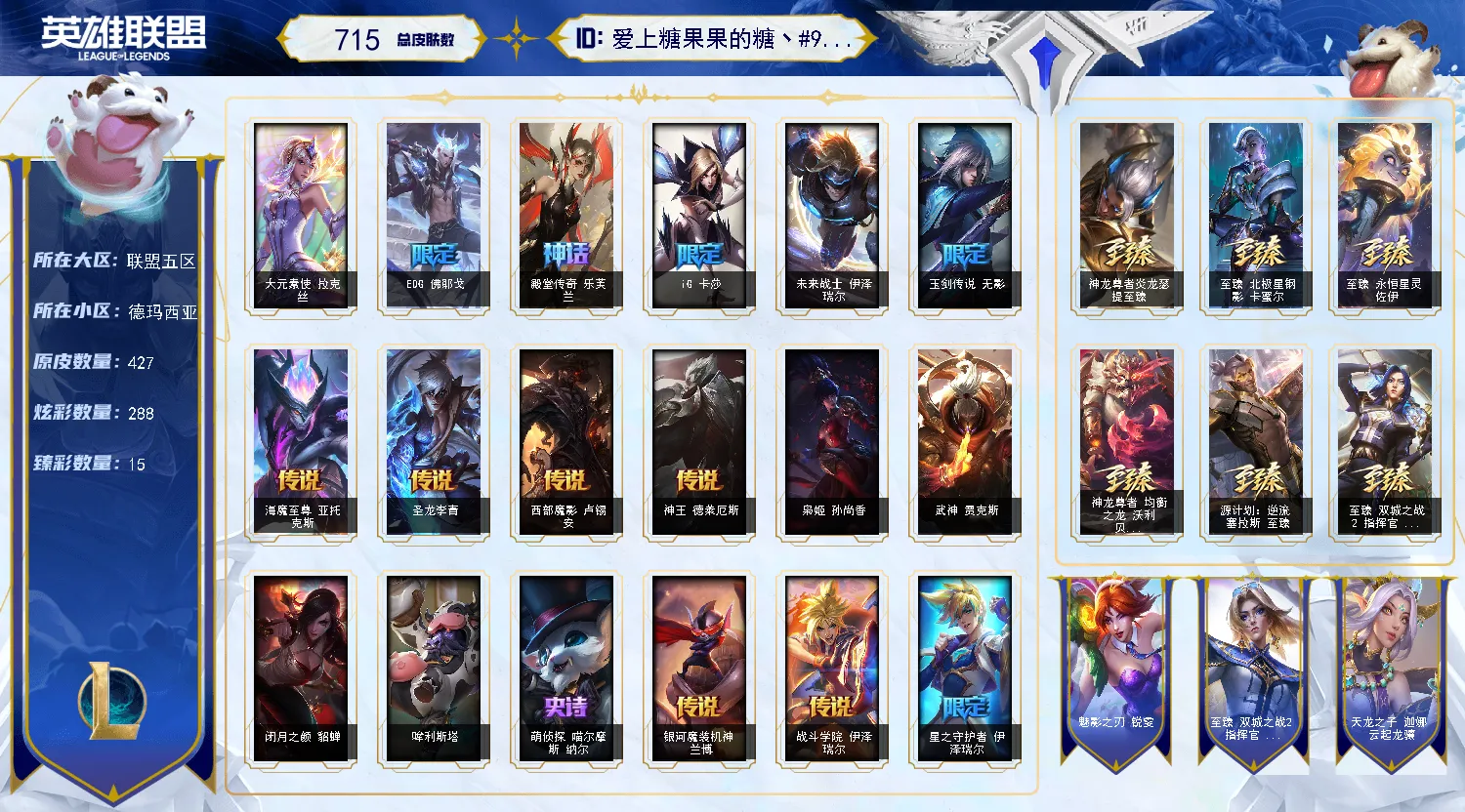 2708皮肤〓可排位妹子号白银〓全英雄〓54神话〓34臻彩〓殿堂传奇乐芙兰〓新蛇年套EDG至臻皇子永恩诺手佐伊剑魔神龙尊者套神王玉剑男刀