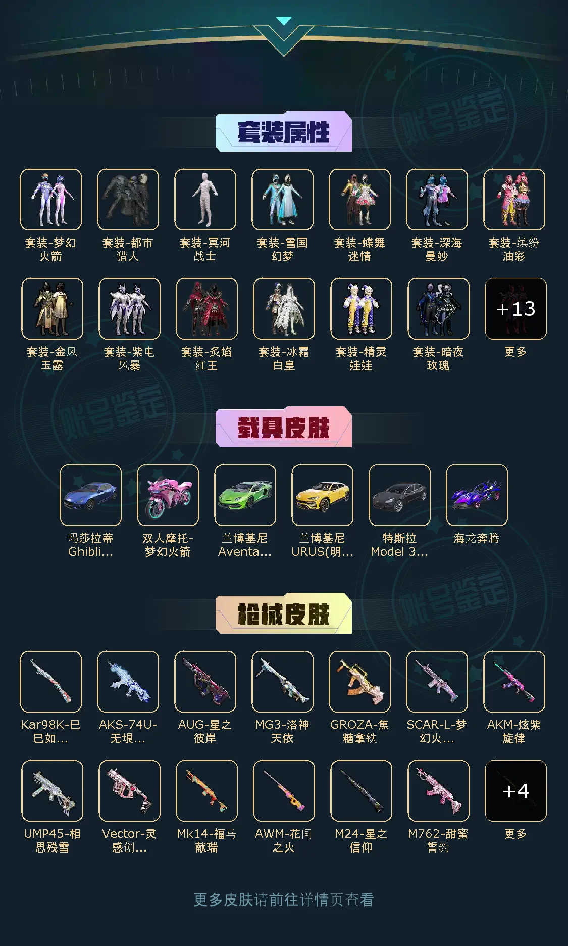 【稀有资产】套装-雪国幻梦/套装-第五大道/套装-缤纷油彩/AUG-星之彼岸/SCAR-L-梦幻火箭/M416-五爪金龙/AKS-74U-无垠阁/木乃伊套装/套装-都市猎人/套装-奇异狩猎者/套装-浪漫天命/套装-潮萌小黄鸭/套装-雪山精英/套装-暗影哥特/套装-龟仙人/套装-迅捷狂鲨/套装-胖达团团/套装-狂沙舞者/套装-奇迹天团/套装-冷酷挑战者/角色-白光莹/M416-仓鼠灰灰/M416-快乐主宰