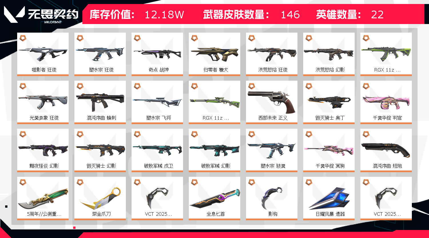 12w库存|22冠军套|五周年 VCT爪|掠影2|超时空套|显卡爪|魔法棒|紫金爪|蝴蝶刀|神之刃