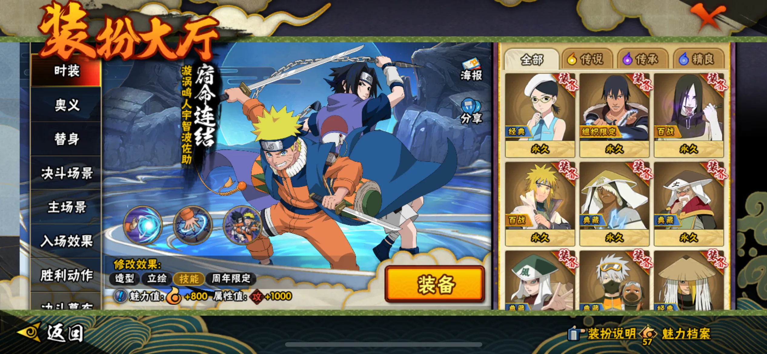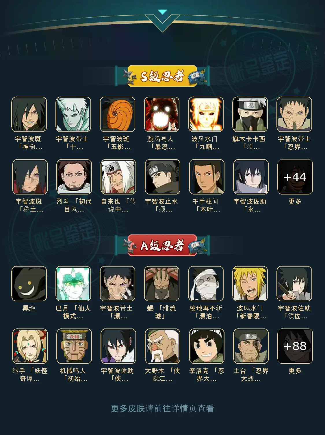仙人自来也 纲手 波风水门 百战水门 猿飞日斩 千手柱间 宇智波斑 宇智波鼬 舞之自来也 大蛇丸 百战大蛇 秽土四代 秽土三代 秽土长门 仙人兜 黄猿九喇嘛鸣人 紫狗永恒佐助 樱婊忍战樱 秽土鼬 普通自来也 百豪纲手 死门凯 二代扉间 秽土二代 秽土初代 秽土柱间 白面具 须佐卡卡西 小胡子鬼灯幻月 雷影 土影 无 佩恩 百战佩恩 青年柱间 创立初代 秽土斑 青年斑 解斑 须佐止水 虎皮 破面带土 红夜带土 罗砂 秽土三代风影 忍战雷影 三代雷影 金角银角 秽土半藏 忍战大野木 小土豆 天道超 大筒木桃式 大筒木金式 钢铁之躯凯 桀骜之刃阿斯玛 狂野之鲨鬼鲛 飞段 黑飞段 百豪樱 忍战李 大卡卡西 五代水影照美冥 宇智波鼬 仙鸣 九尾查克拉鸣人 鹰佐 奇拉比 青年艾 半蛇兜 晓蛇 新春鼬 面麻 须佐佐助 疾风咒印佐助 忍战宁次 忍战天天 最终章雏田 幻容卡卡西 神卡 忍战卡卡西 泳装卡卡西 忍战凯 青春哥 惊门凯 爱情哥 新春止水 新春水门 青年水门 青水 新春我爱罗 泳装照美冥 侠隐照美冥 侠隐纲手 侠隐兜 漂泊再不斩 漂泊佩恩 漂泊二代 漂泊小南 漂泊佩恩 三船 青年三船 青年长门 泳装南 新春南 黑绝 新春大蛇丸 晓创生角度 晓创生蝎 晓创生飞段 泳装鼬 鲛肌融合鬼鲛 新春迪达拉 秽土迪达拉 恶灵之影飞段 暴怒带土 忍战黄土 卑留呼 桃博 黑土