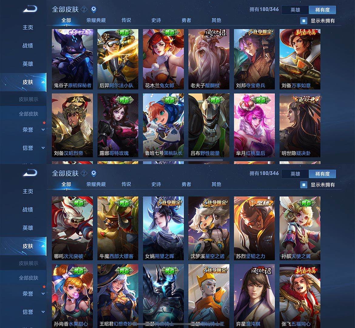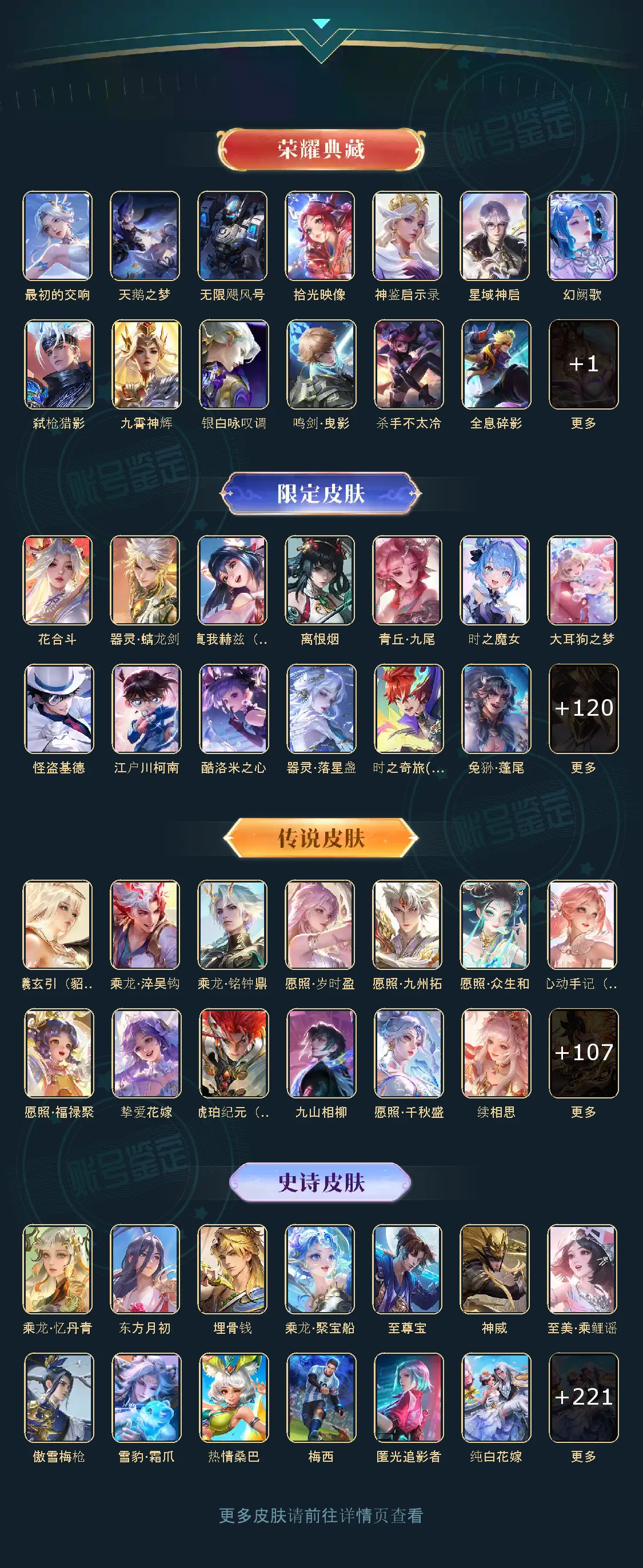 贵族等级V10无双贵族,英雄数量129,典藏皮肤数14,皮肤数量720,冰锋战神街头霸王天鹅之梦纯白花嫁天魔缭乱至尊宝杀手不太冷真爱至上王者之锤凤求凰热情桑巴逐梦之影武陵仙君神奇女侠梅西无限飓风号黄金狮子座一生所爱全息碎影大圣娶亲冰霜恋舞曲青龙志白虎志朱雀志太华久胜战神飞衡梁祝倪克斯神谕白鹤梁神女匿光追影者鸣剑·曳影遇见胡旋龙胆星域神启李逍遥武圣奔雷神使孙行者玉兔公主补天异界灵契神威启示之音傲雪梅枪淬星耀世时雨天司