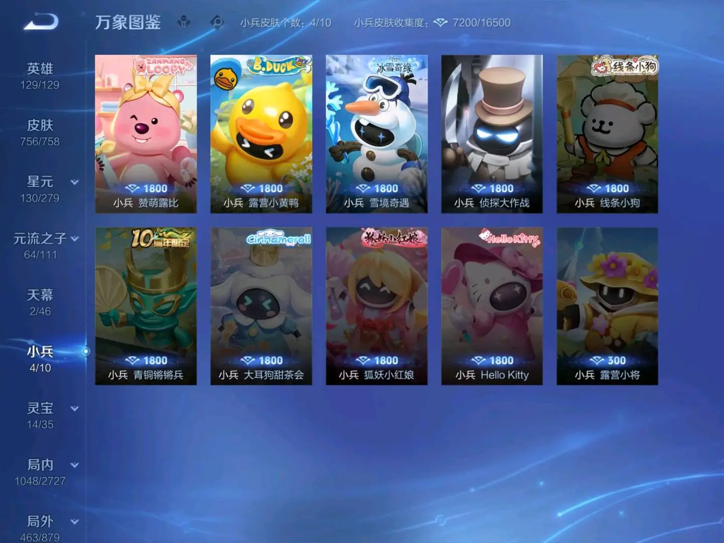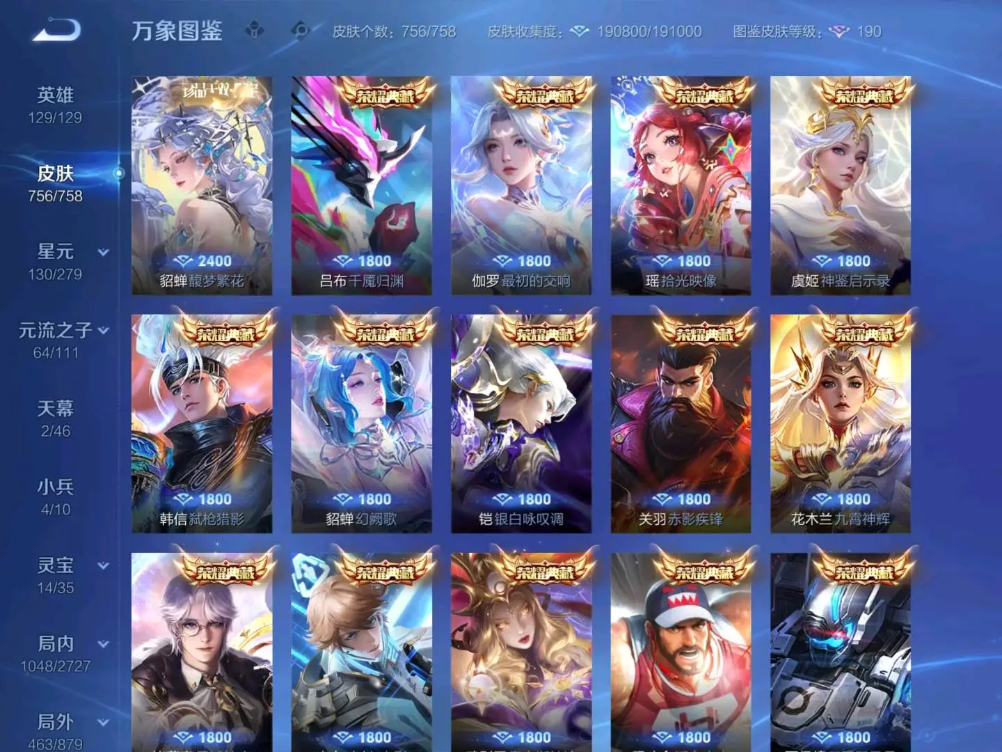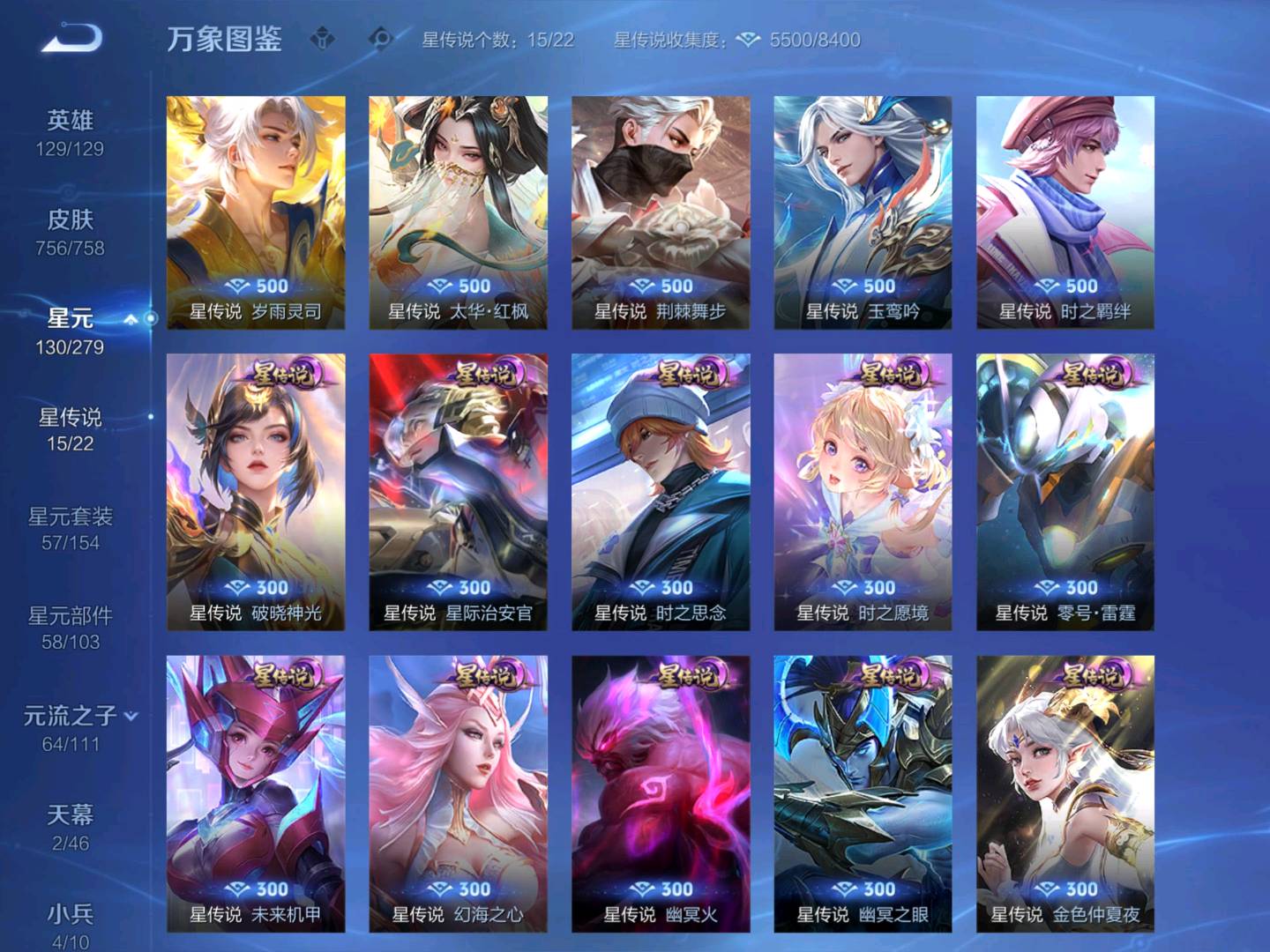 天鹅之梦,星空梦想,无限飓风号,鸣剑·曳影,神鉴启示录,赤影疾锋,星域神启,幻阙歌,拾光映像,最初的交响,弑枪猎影,九霄神辉,银白咏叹调,器灵·螭龙剑,神器·明辉仪,群星魔术团(韩信),真我赫兹(瑶),离恨烟,碎月剑心,雪境奇遇(甄姬),青丘·九尾,时之魔女,馥梦繁花,天魔缭乱,白虎志,默契交锋(兰陵王),李逍遥,默契交锋(花木兰),零号·赤焰,大耳狗之梦,怪盗基德,炽阳神光,江户川柯南,圣诞老人,热情桑巴,梅西,乘龙·问璇玑,乘龙·淬吴钩,乘龙·铭钟鼎,愿照·岁时盈,乘龙·聚宝船,乘龙·忆丹青,酷洛米之心,至尊宝,神威,纯白花嫁,真爱至上,纵目迁山,愿照·九州拓,愿照·众生和,匿光追影者,天机白泽,冥王哈迪斯,心动手记(朵莉亚),时之奇旅(大乔),时之奇旅(鲁班七号),落雪白狼,愿照·福禄聚,无双飞将,至美·化雀舞,时之祈愿瑶,遇见神鼓,挚爱之约,挚爱花嫁,花合斗,霜北刀,逐花归海,器灵·落星盏,琥珀纪元(马超),九山相柳,至美·乘鲤谣,鹤羽星尊,时之奇旅(孙策),曦玄引(貂蝉),愿照·千秋盛,霜月吟,东方月初,妄想实况,埋骨钱,深海之息,黄金天蝎座,夜礼服假面,兔狲·蓬尾,补天,惊梅引,续相思,异界灵契,祥瑞亨通,黑崎一护,启示之音,影龙天霄,心动手记(海诺),神树通天,朽木白哉,云诺千山,鹤归松栖(云缨),愿照·山河定,千劫归真,傲雪梅枪,雪豹·霜爪,神罪