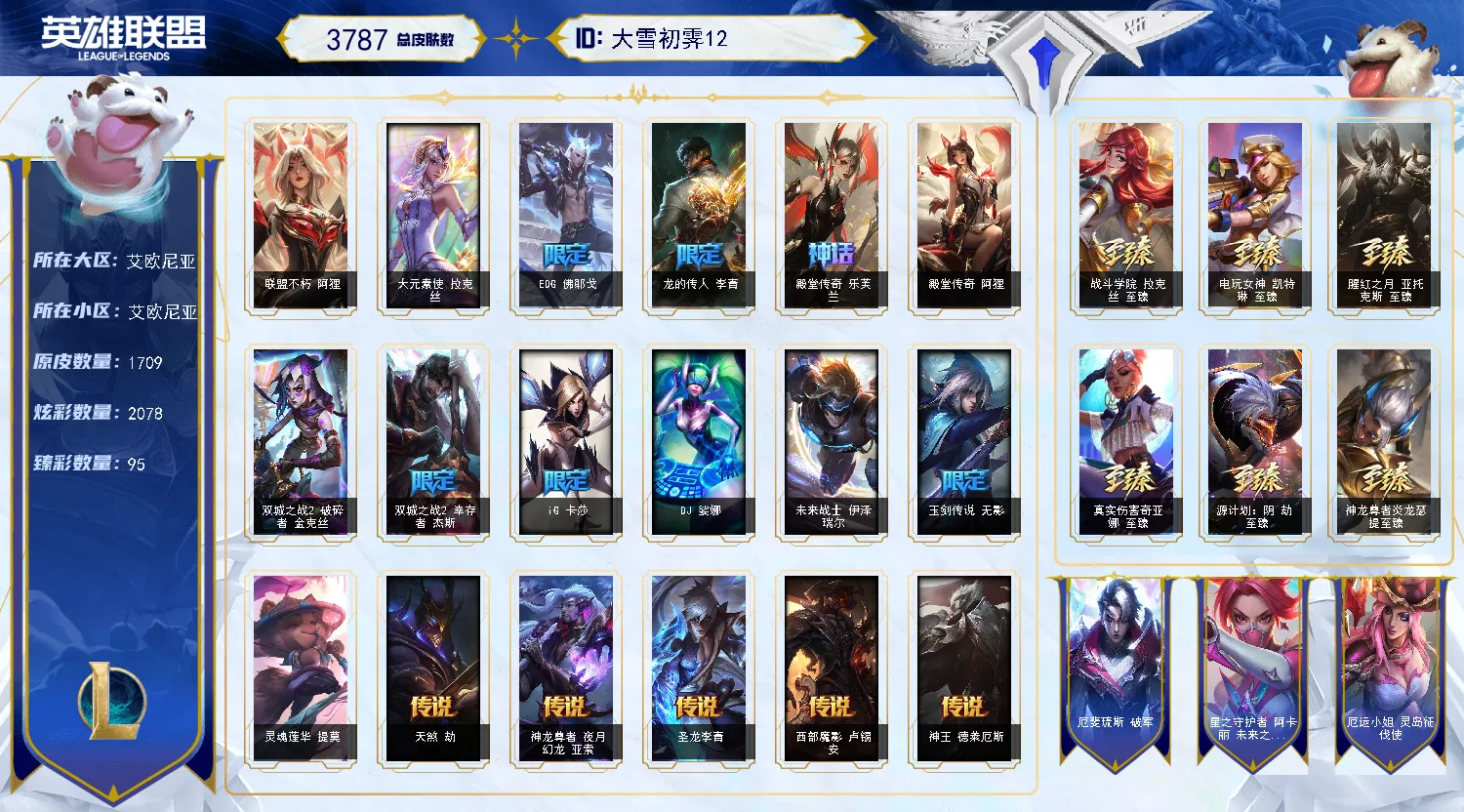 云顶、峡谷皮肤超级号1700原皮-晴天-艾欧尼亚-不朽阿狸-满终极皮肤-云顶65神话!