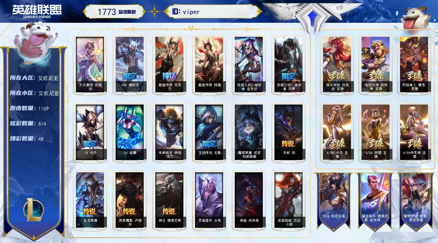 艾欧尼亚|1763皮|69神话|殿堂阿里|圣堂金克丝|EDG破军套|斗魂莲花套|云顶七神话|男女刀