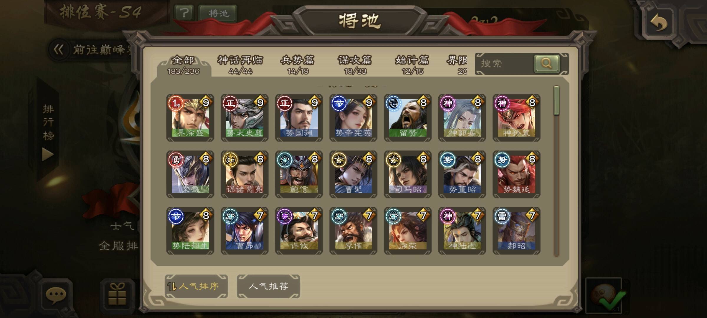 势国渊,势辛宪英,势董昭,势曹髦,势司马昭,势魏延,谋诸葛亮,谋关羽,鲍三娘,势太史慈,势陆郁生,文鸯,张奋,势于吉,刘焉,徐荣,十常侍,神郭嘉,神孙策,神荀彧,神鲁肃