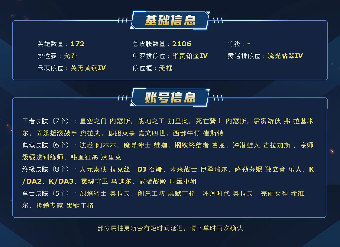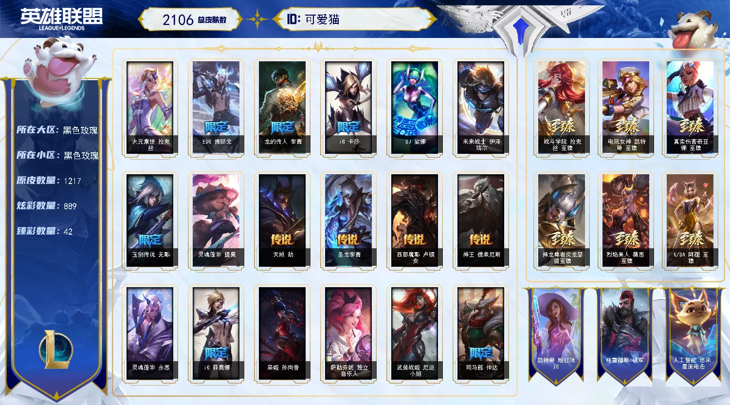 【捡漏】█ 海克斯满级 █ 2105皮 █ 允许排位 █ 黑色玫瑰█双色龙虾█245限定█41臻彩█