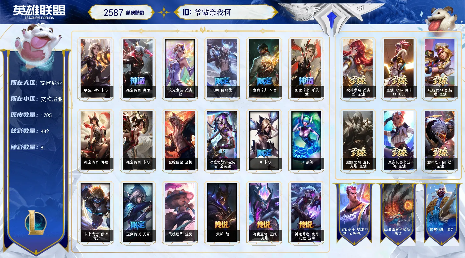 艾欧尼亚原皮1700/️全英雄可下棋可排位/不朽卡莎名人堂阿狸/2圣堂/9终极️/144神话至臻/