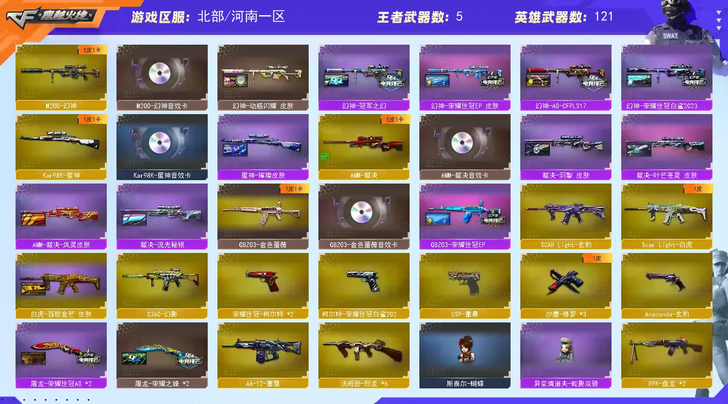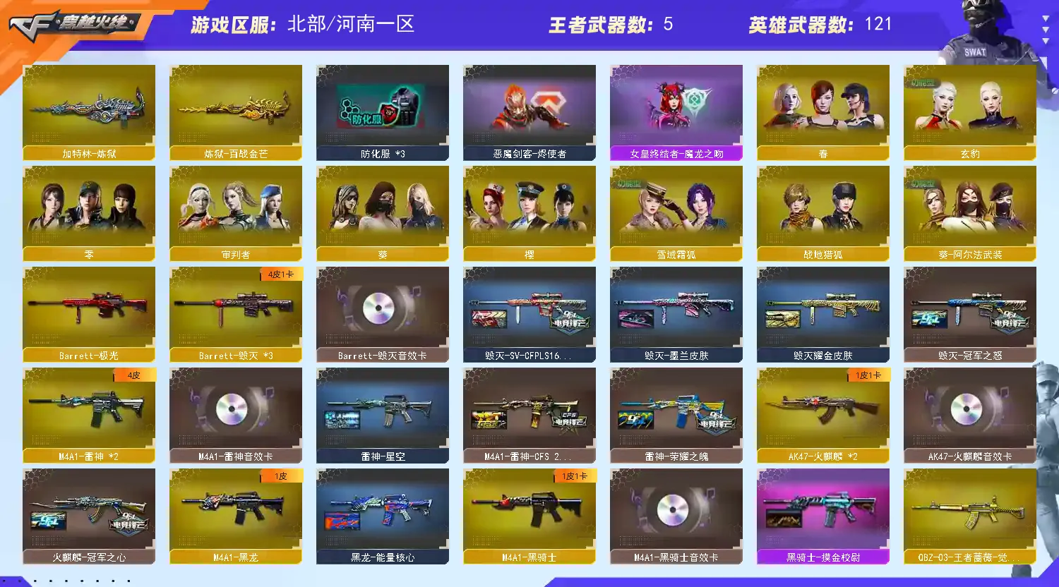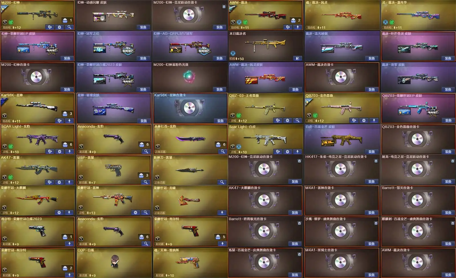 多四防角色,各种皮肤武器光效玩偶道具,欢迎来体验!武器太多,截不了那么多图!【此号全部装备太多截不了太多图,还有很多神器未截图,普通CF点武器也是一百多个就不截图了(满背包满道具爆破、生化、挑战武器应有尽有多个玩偶主流武器多光效),主流枪械都有皮肤】