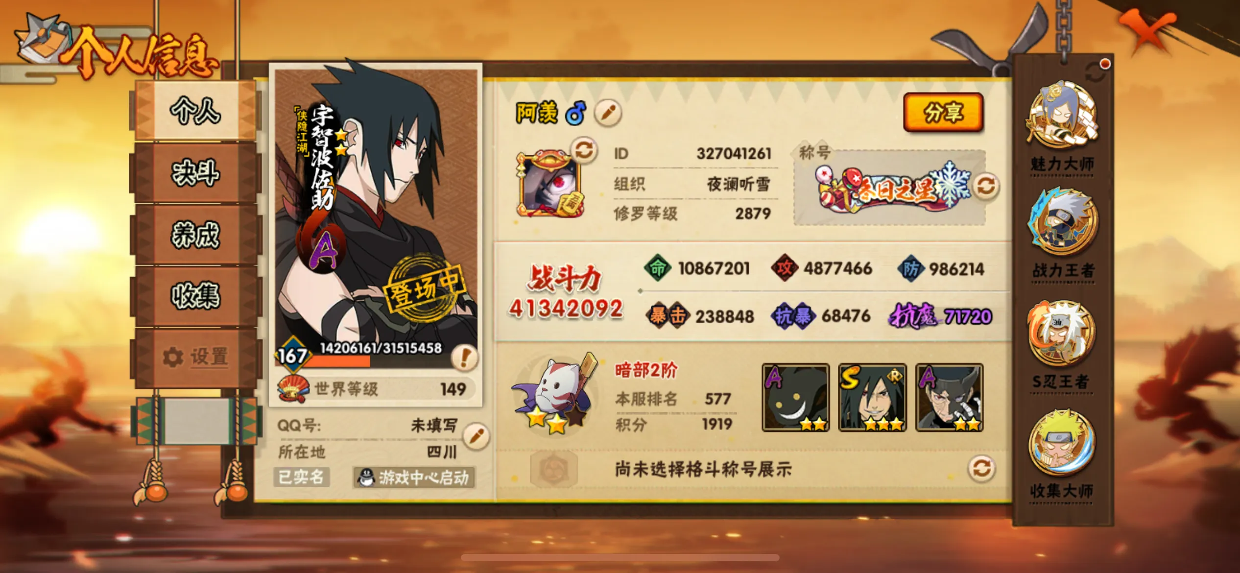 十尾带土🔥4200万战力🔥多场景全通灵全密卷🔥425忍🔥侠影佐助全套高魅号